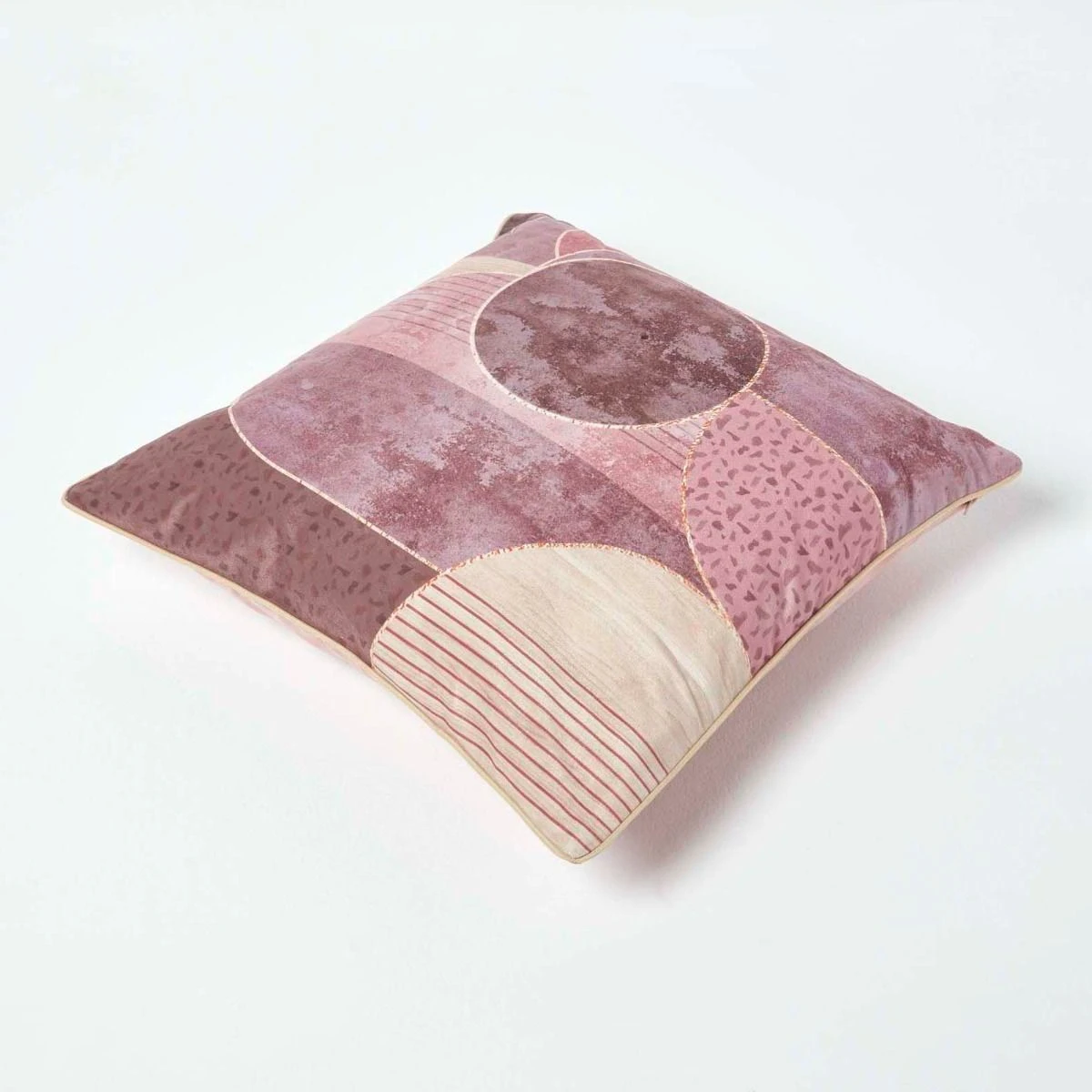 Luxury pink scatter cushion with feather filling. A textured linen and velvet geometric style cushion in pink and cream, this decorative cushion is perfect for sofas and bedrooms.