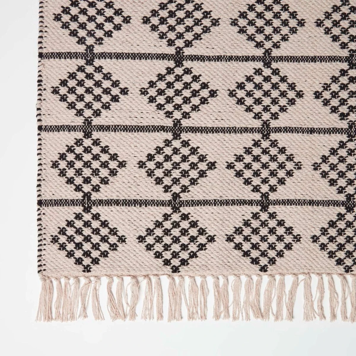 Adana patterned woven rug in black and natural. Available in two sizes, this monochrome rug has been handwoven from luxury 100% cotton and features macrame tassels.