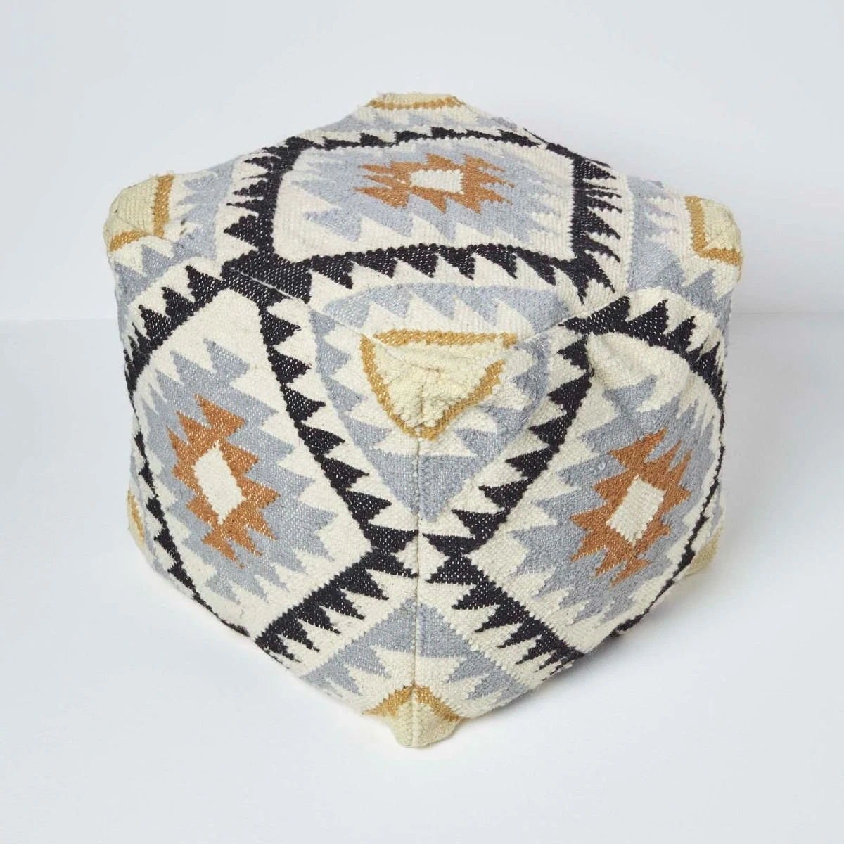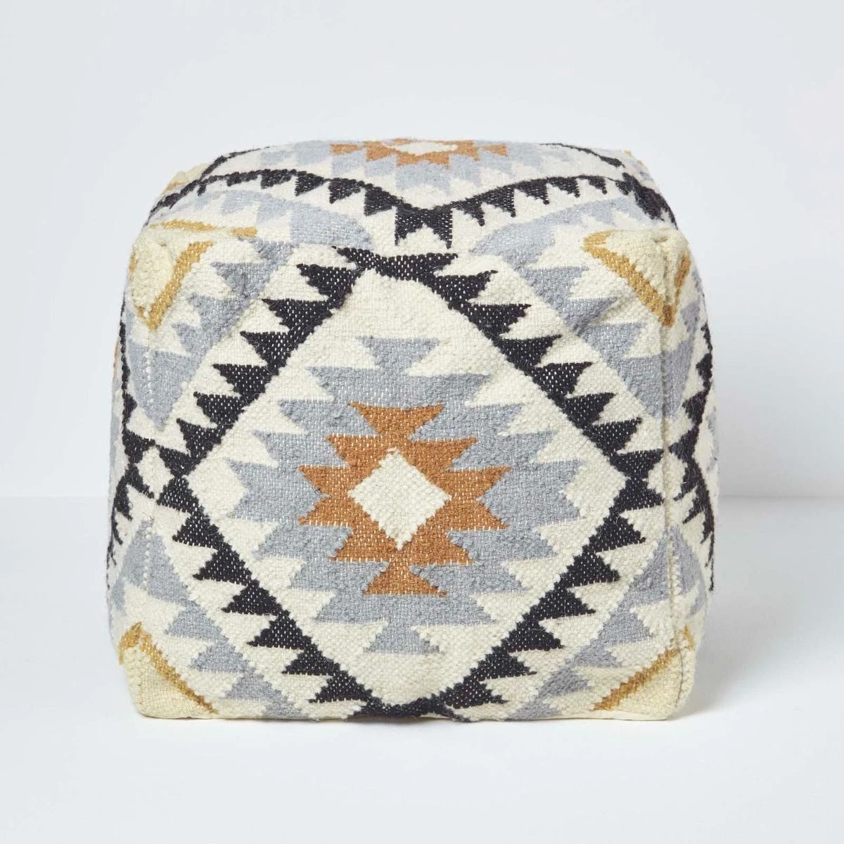 Black and gold kilim footstool handcrafted from durable wool and cotton. Featuring a traditional style gold, grey and black geometric pattern, this striking footstool measures 43 cm square and is perfect for styling in living spaces and conservatories. A unique colourful pouffe that will make an impact in your home it is the perfect size to be used as an occasional seat or for resting your feet after a long day.