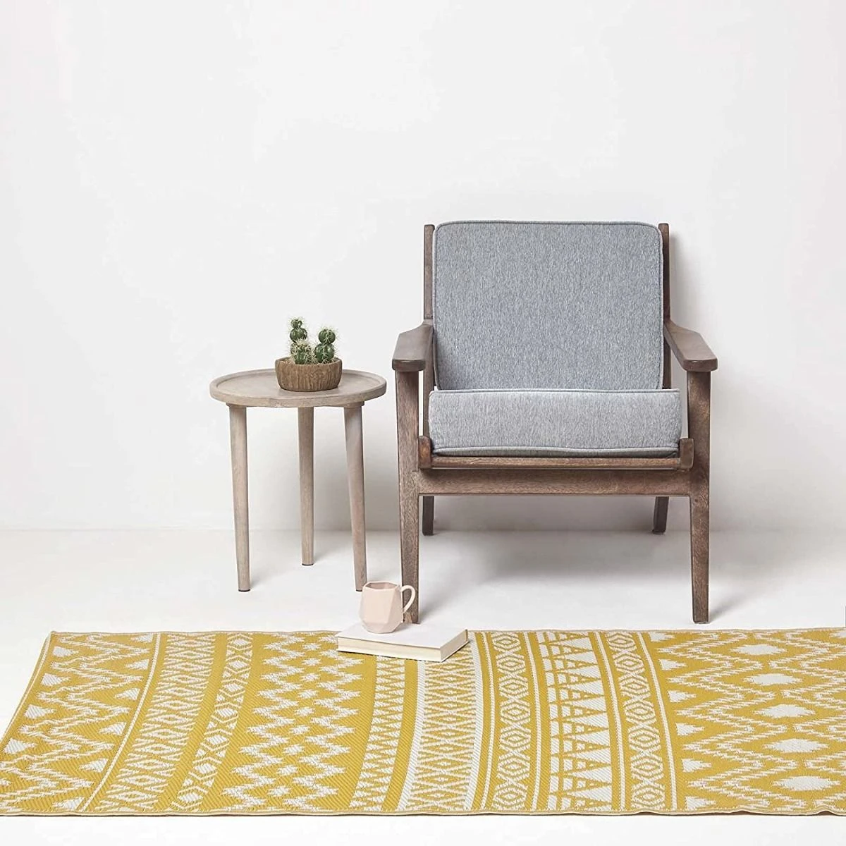 The Homescapes Aztec white and yellow outdoor rug is woven from 100% recycled plastic, while being both light weight and weather resistant, as well as durable.