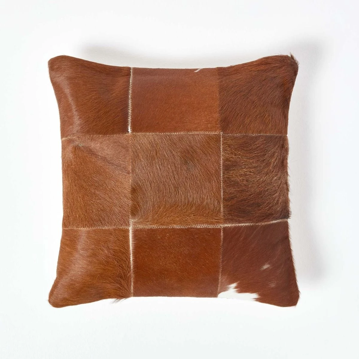 Square cushion handcrafted from natural suede with a natural goat hair patchwork pattern, this brown shade check design decorative cushion measures 45 x 45 cms.