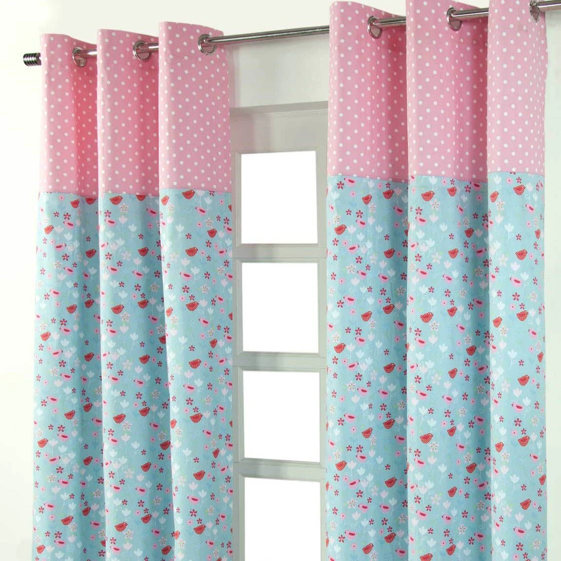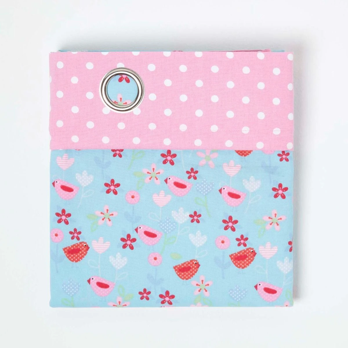 The baby blue background of our Birds and Flowers Eyelet Curtains matches perfectly with the white and baby pink polka dotted patchwork panels that line the top and bottom of these endearing curtains. These soft spring colours are sure to lighten and brighten the decor of any room. These lovely Birds and Flowers Eyelet Curtains are one pair in Homescapes impressive range of pure cotton designer curtains in many charming designs and soft prints. Our modern ring top or eyelet curtains are made with heavy cotton fabric and a wide range of colours, which allows our curtains to coordinate well with almost any interior setting and the vibrant colours used are able to uplift the mood of any room. These curtains are suitable for all spaces, and would fit perfectly in the kids rooms due to their refreshing print. Please note, these curtains are not lined and so they will have to be used in conjunction with a black out curtains in order to make them light proof. Coordinating fabric (to make your own soft furnishings), cushions and floor cushions are also available with Homescapes.
