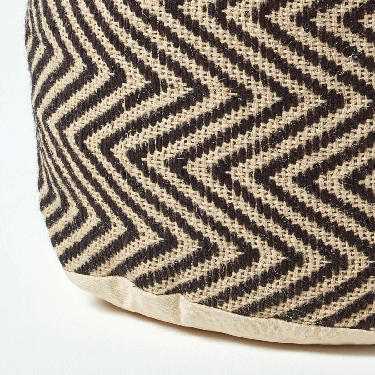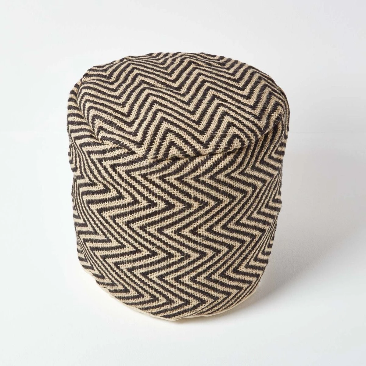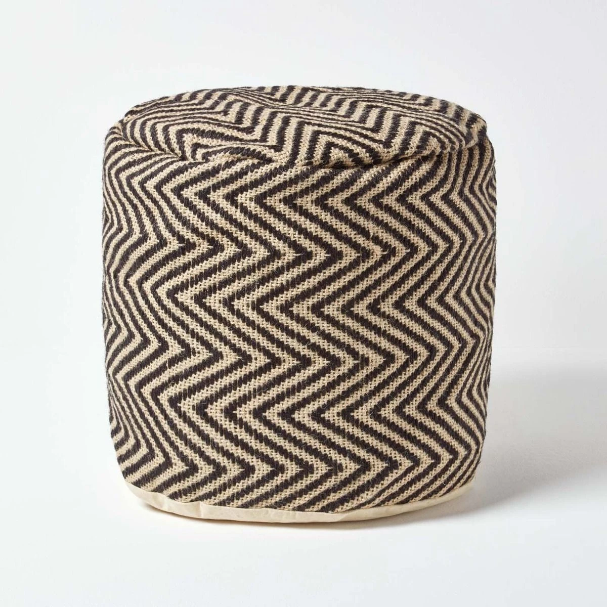 100% jute herringbone pattern circular footstool from Homescapes, filled with polystyrene beans and double lined to ensure it maintains its structure and shape.