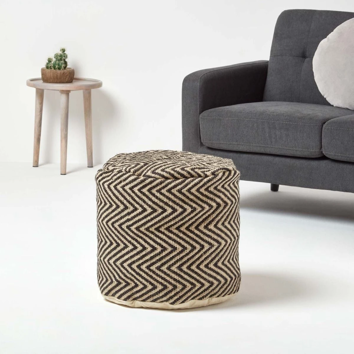 A contemporary style chevron pattern which will complement most room decors, Homescapes tall, circular, herringbone style jute pouffe is pre-filled with polystyrene beanbag balls, giving you maximum comfort and relaxation. Made from 100% jute, this pouffe is great to use as a footstool or occasional chair when you are entertaining guests.