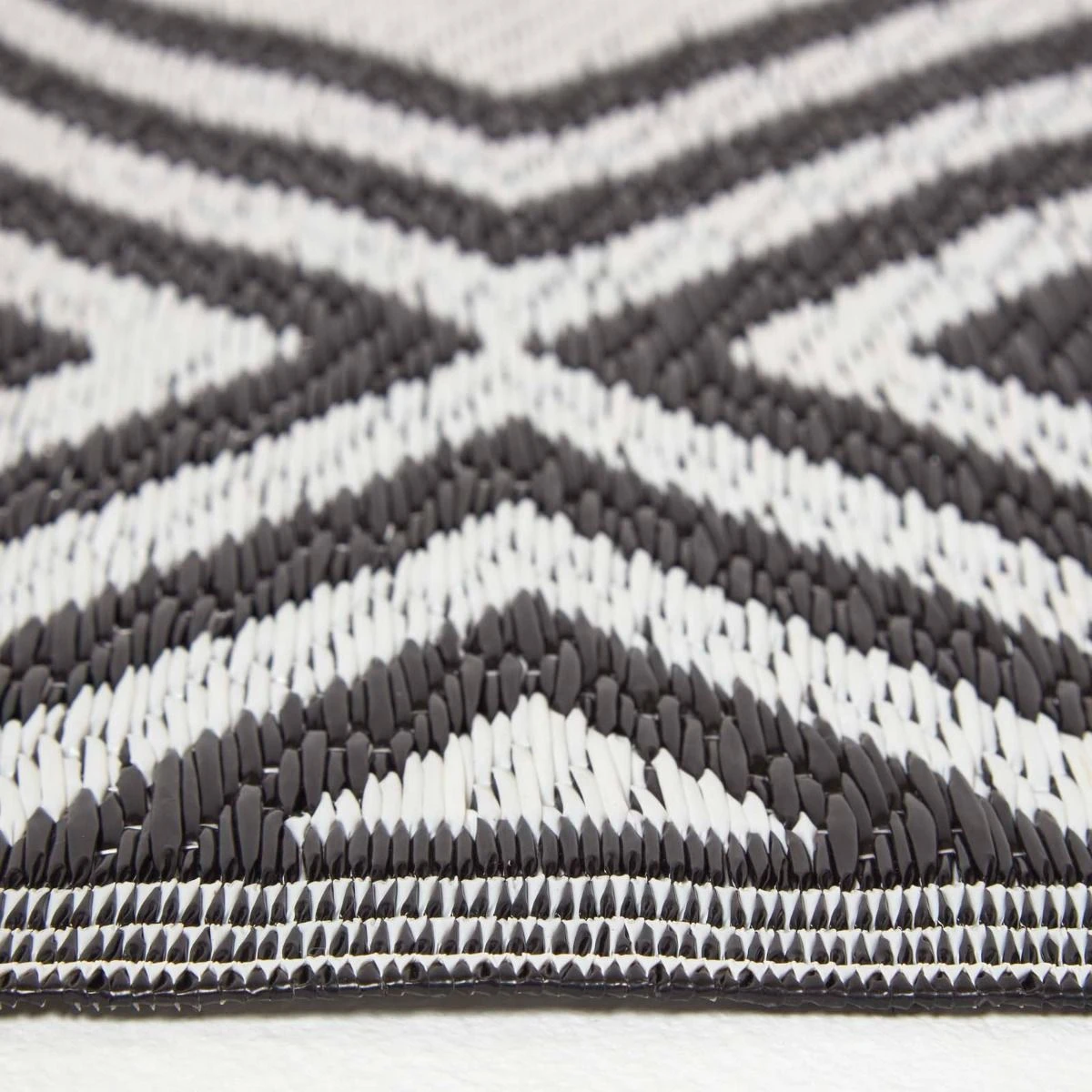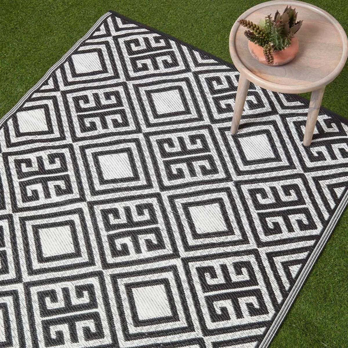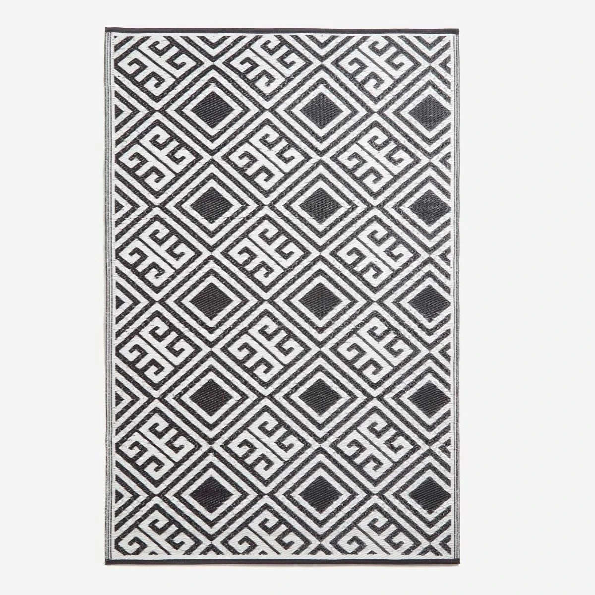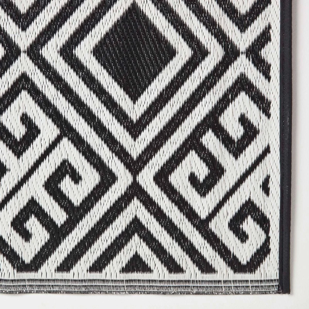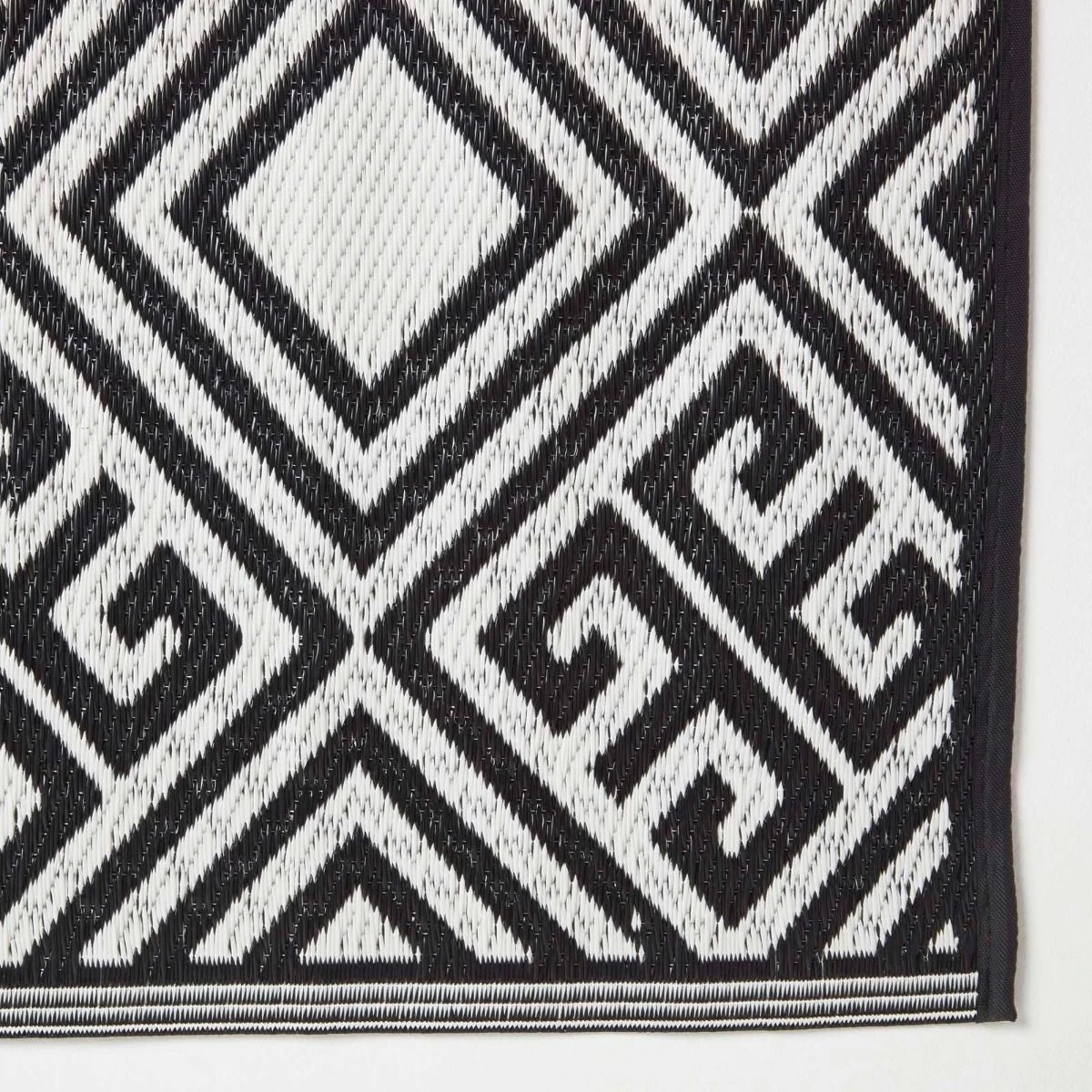 A reversible garden rug from Homescapes featuring a black and white geometric pattern. Made from plastic this rug is weather resistant.