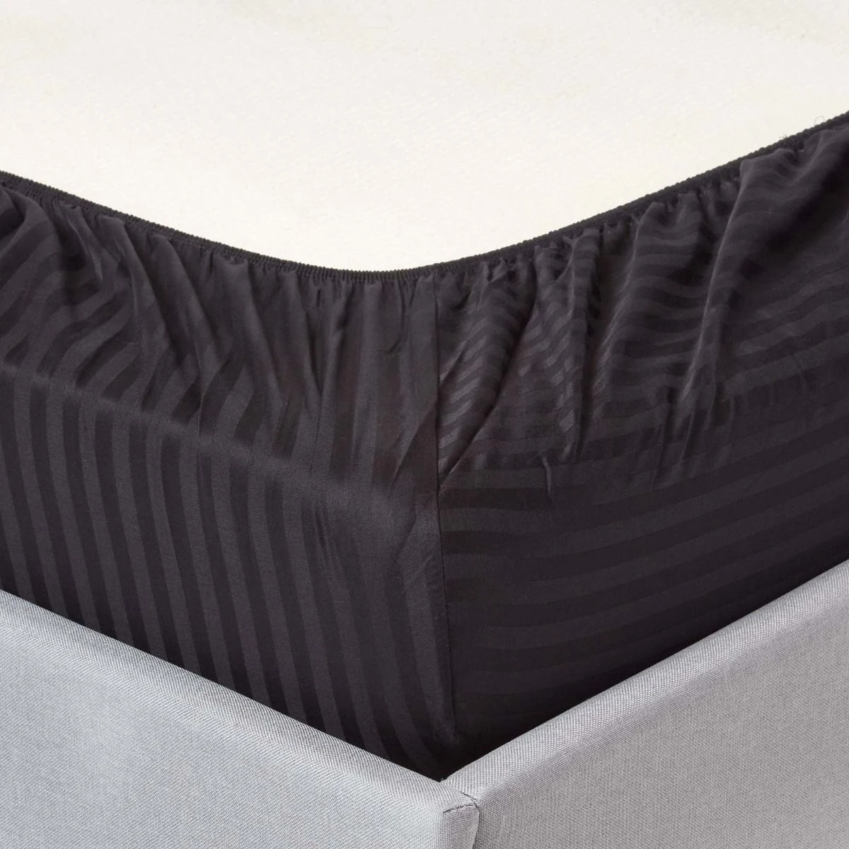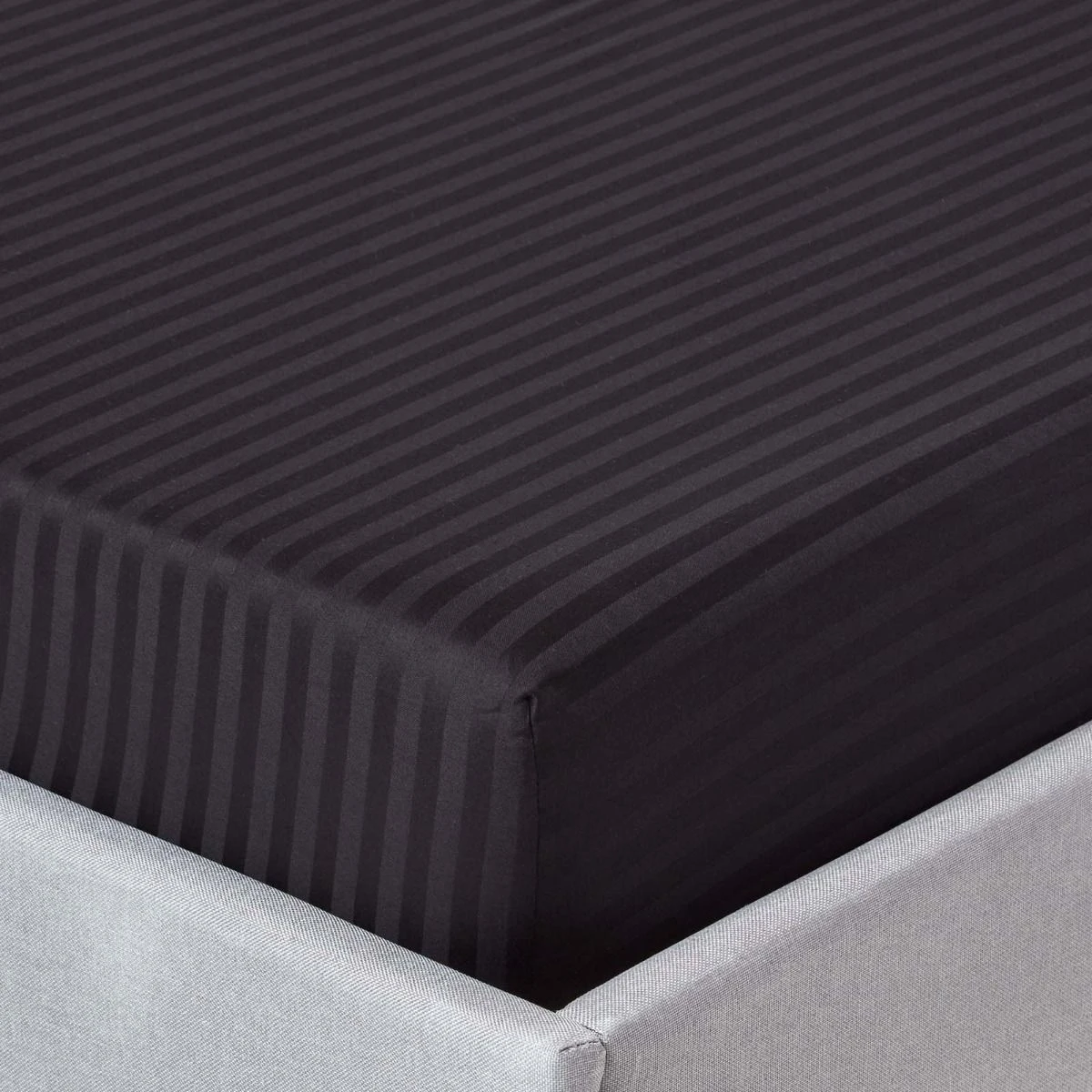Modern and stylish, black fitted sheet, woven from 330 thread count pure Egyptian cotton, soft and breathable elasticated sheet with satin stripe.
