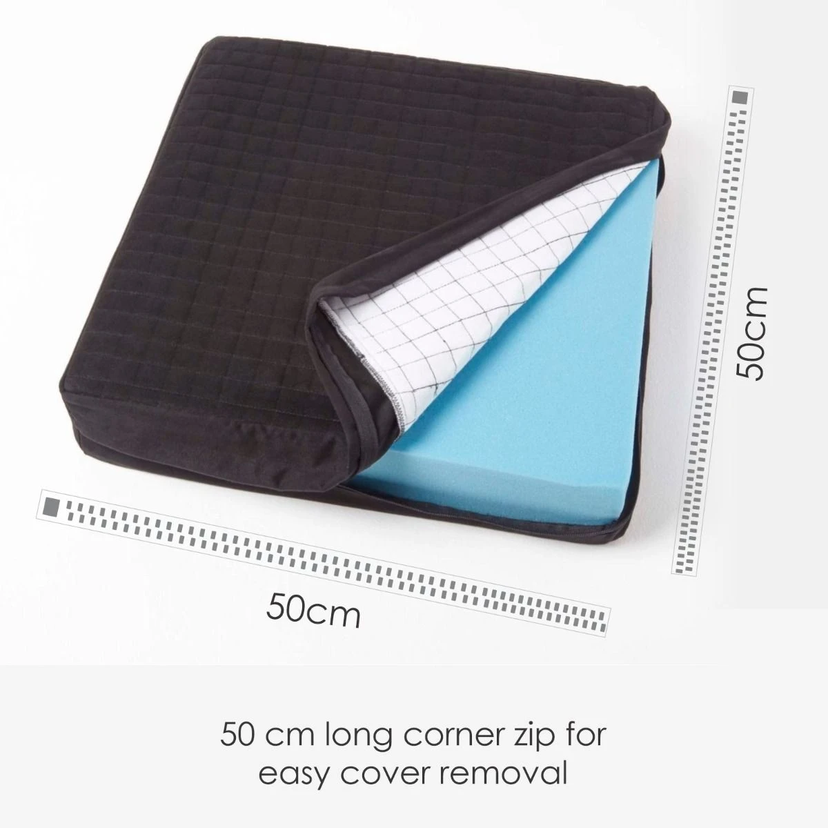 Super soft black faux suede removable cover armchair booster cover, deep, firm and supportive orthopaedic foam booster cushion with removable cover measuring 50cm square.