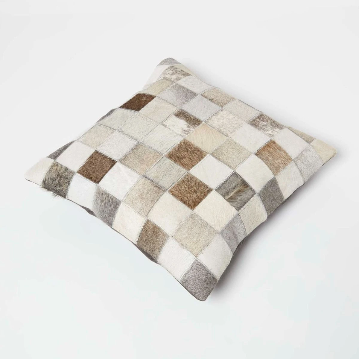Crafted for both comfort and style, this generously filled sofa cushion has a patchwork leather hide front in shades of grey and cream, with a grey suede reverse cover. This textured cushion features an on-trend check design, making it the ideal statement piece for your living space or bedroom. Due to the natural materials used and handmade nature, each leather cushion will appear slightly different than the image shown.