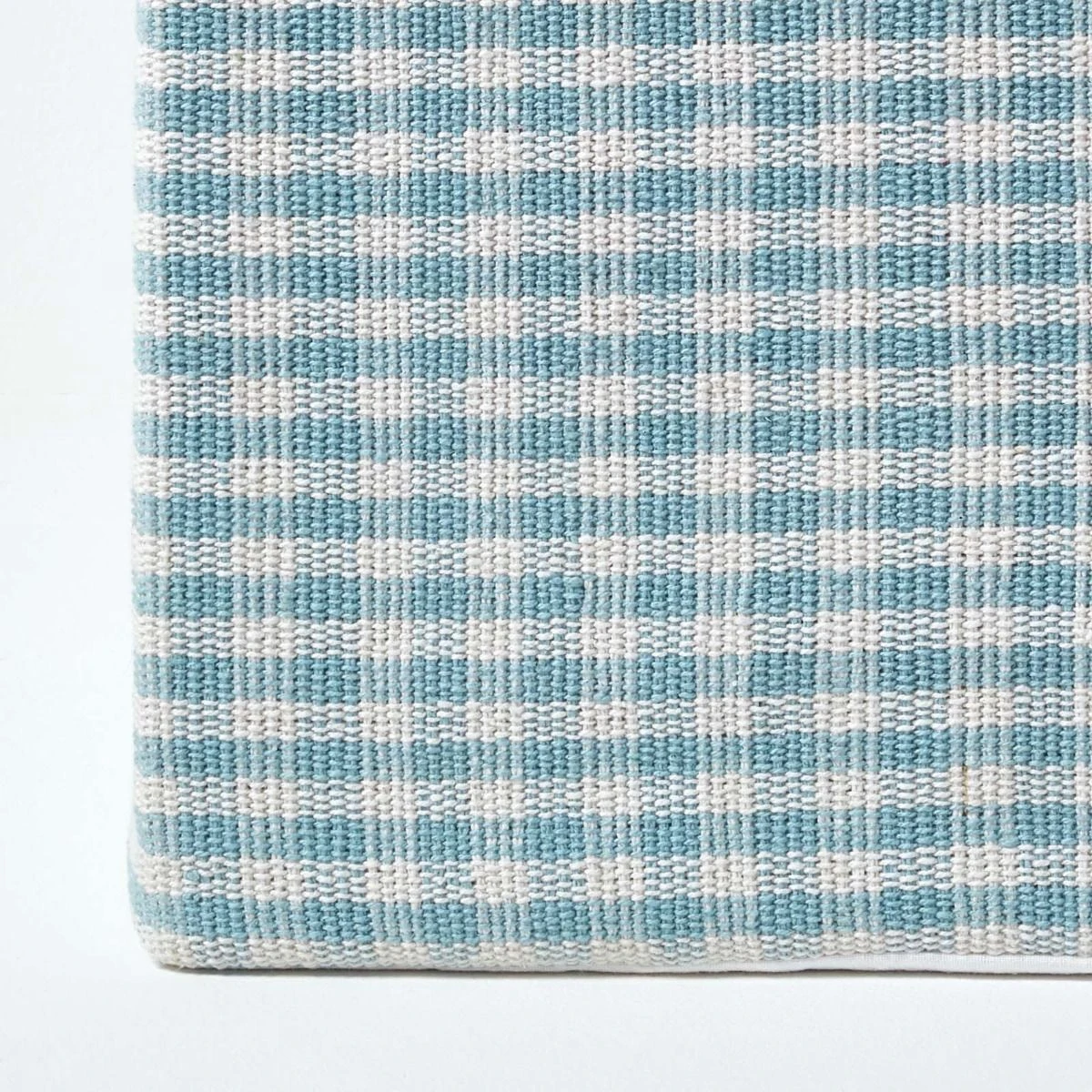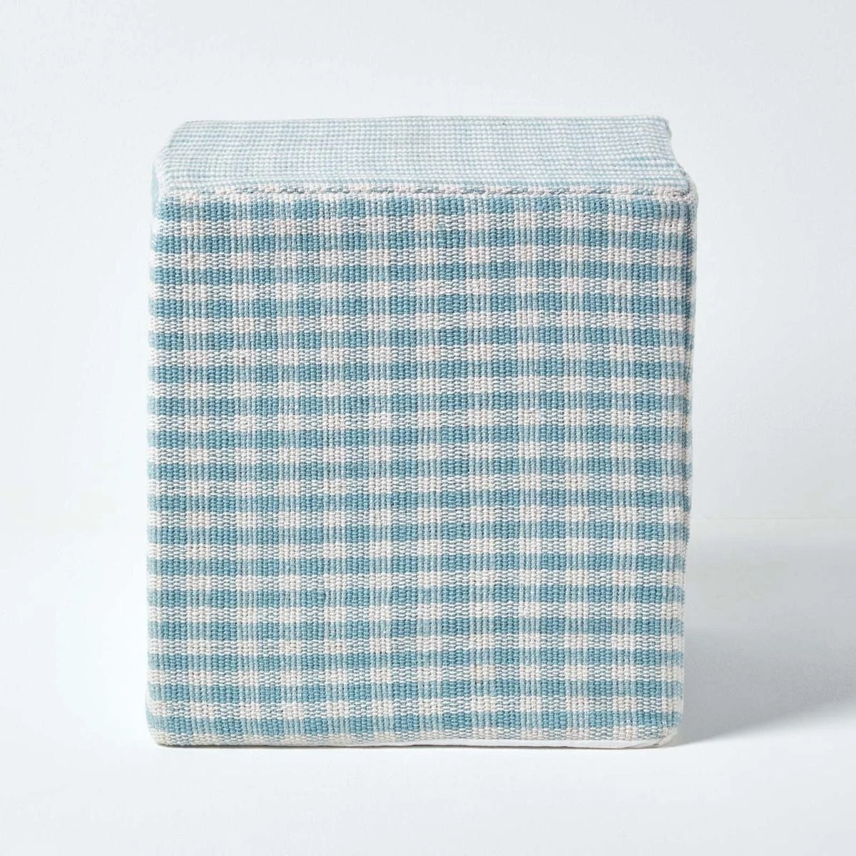 Homescapes lightweight cube pouffe upholstered in cotton with a classic blue gingham, available in three colour combinations and a round shape.