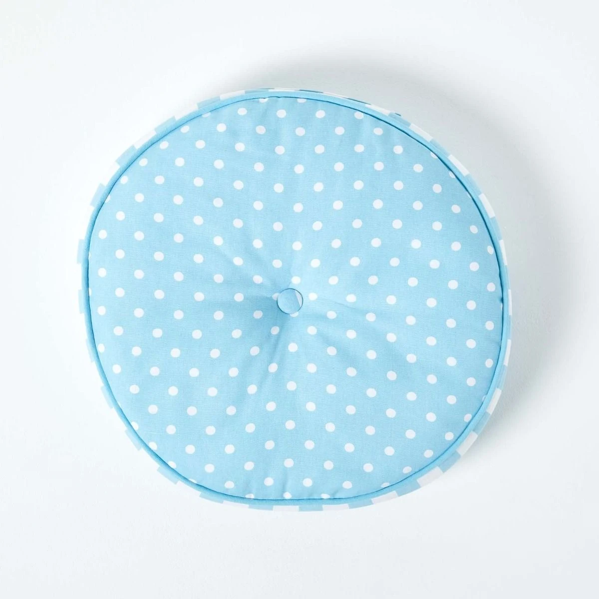 Blue and white polka dot floor cushion, this round cushion can be used on the floor, on garden furniture or by children for playing and napping. Woven from 100% cotton, the spotted cover features a handy carry handle for easy transportation. Prefilled with super microfibre, it will add that extra layer of comfort whilst sitting.