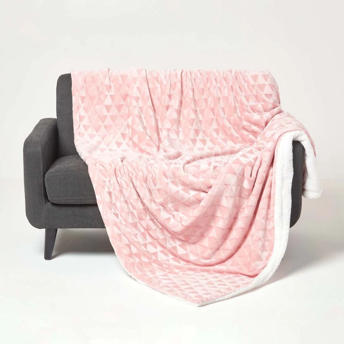 Soft and fluffy blush pink throw for sofas and beds geometric throw with on-trend triangular pattern, this cosy velvet throw is available in 3 large sizes.