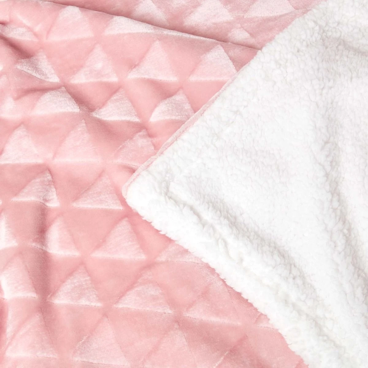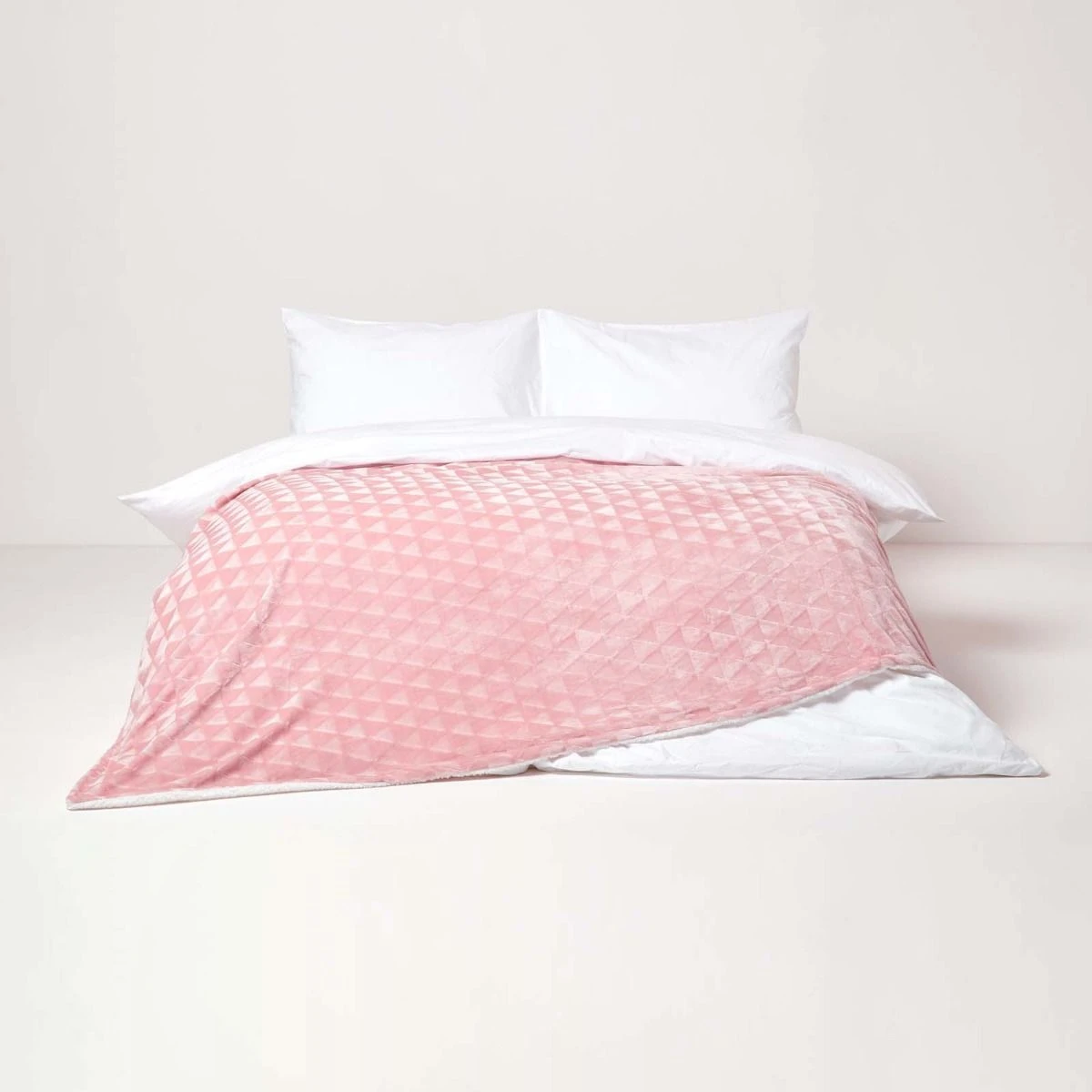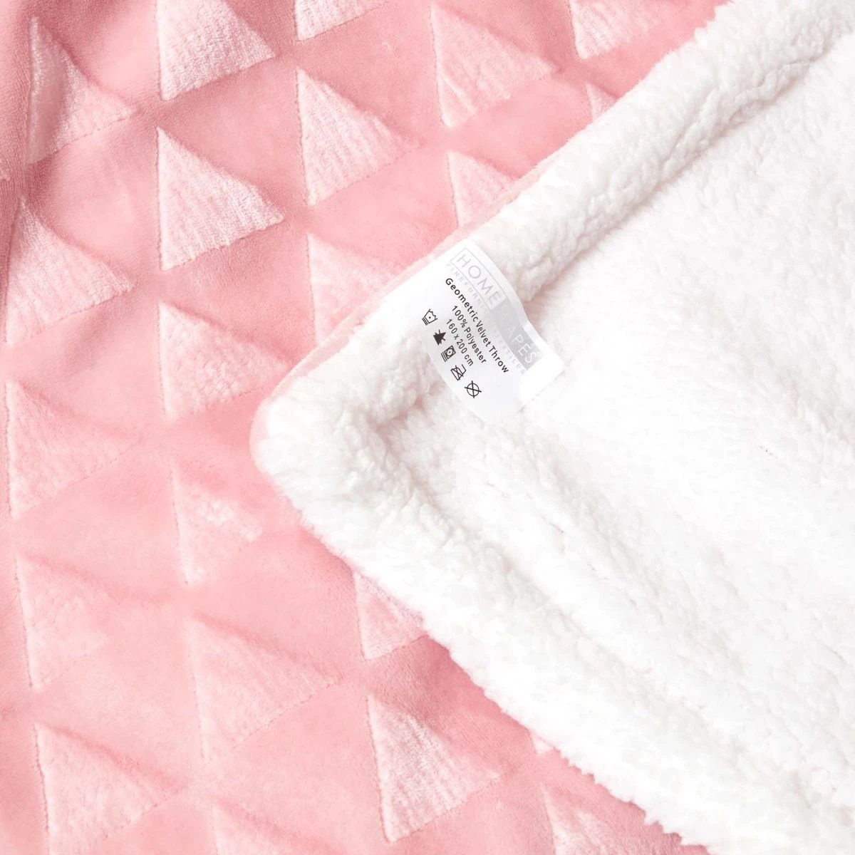 Thick and soft blush pink throw for beds and sofas, this fluffy blanket is cosy and warm and is perfect for cooler months. Featuring an on-trend triangular pattern, this geometric throw is woven from a super soft velvet and has a cream Sherpa fleece reverse.