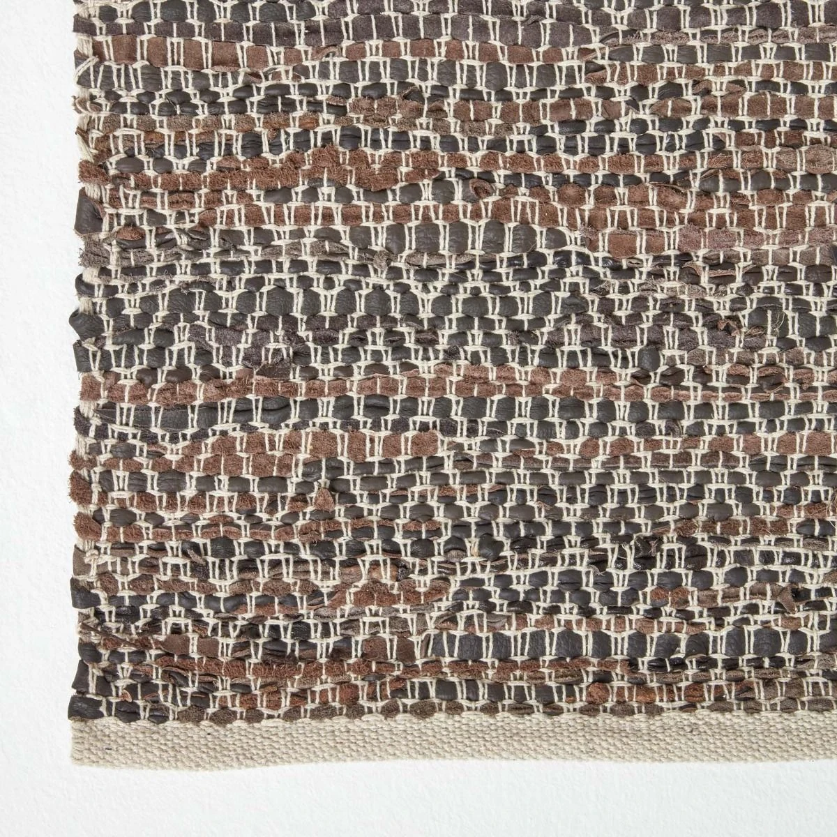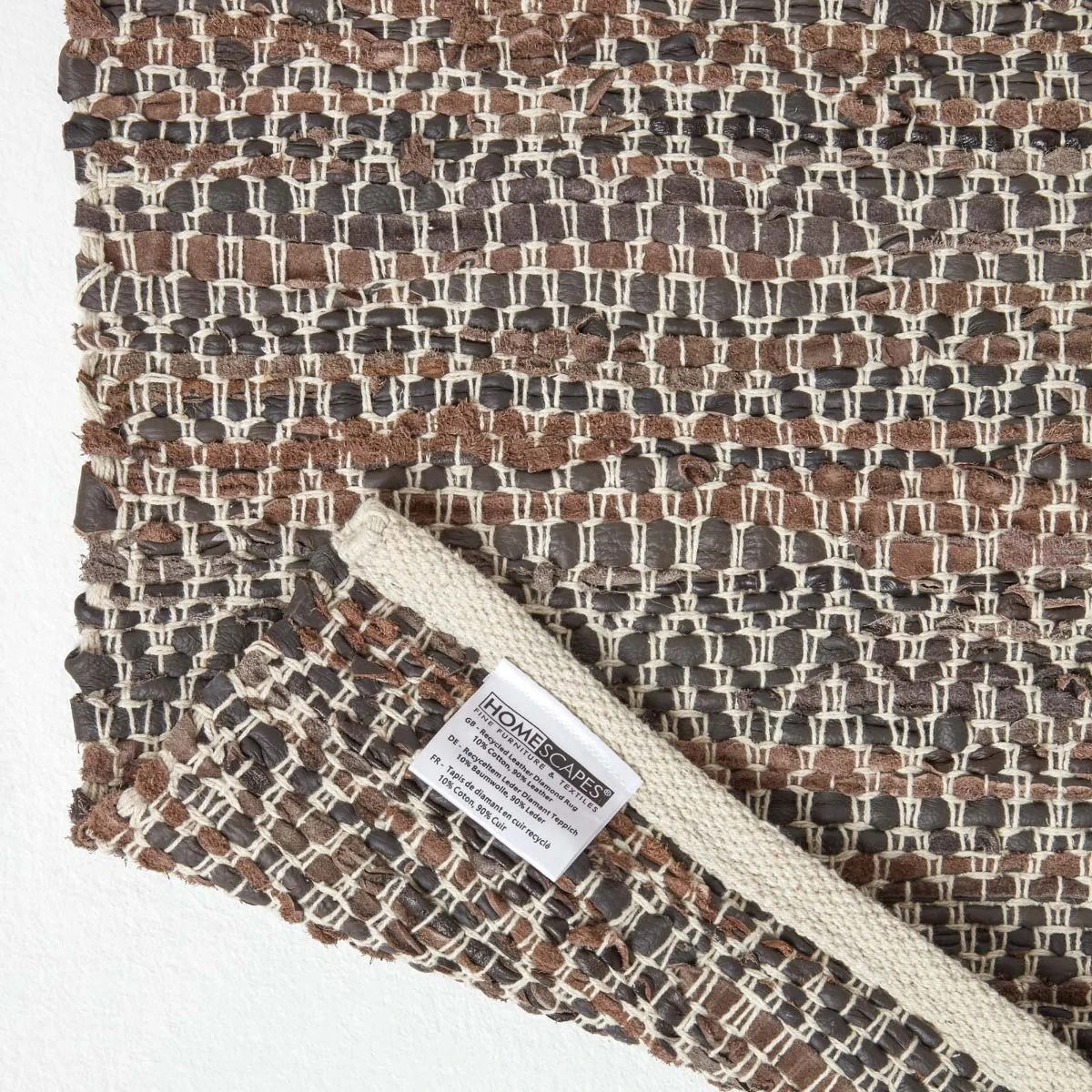 Handwoven natural brown leather rug from Homescapes featuring a modern, diamond pattern design, a hardwearing textured rug available in various sizes.