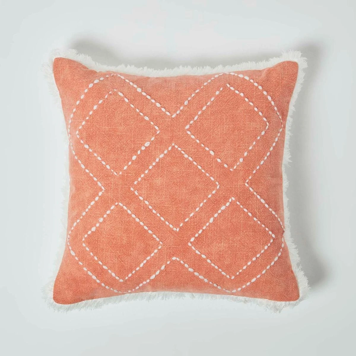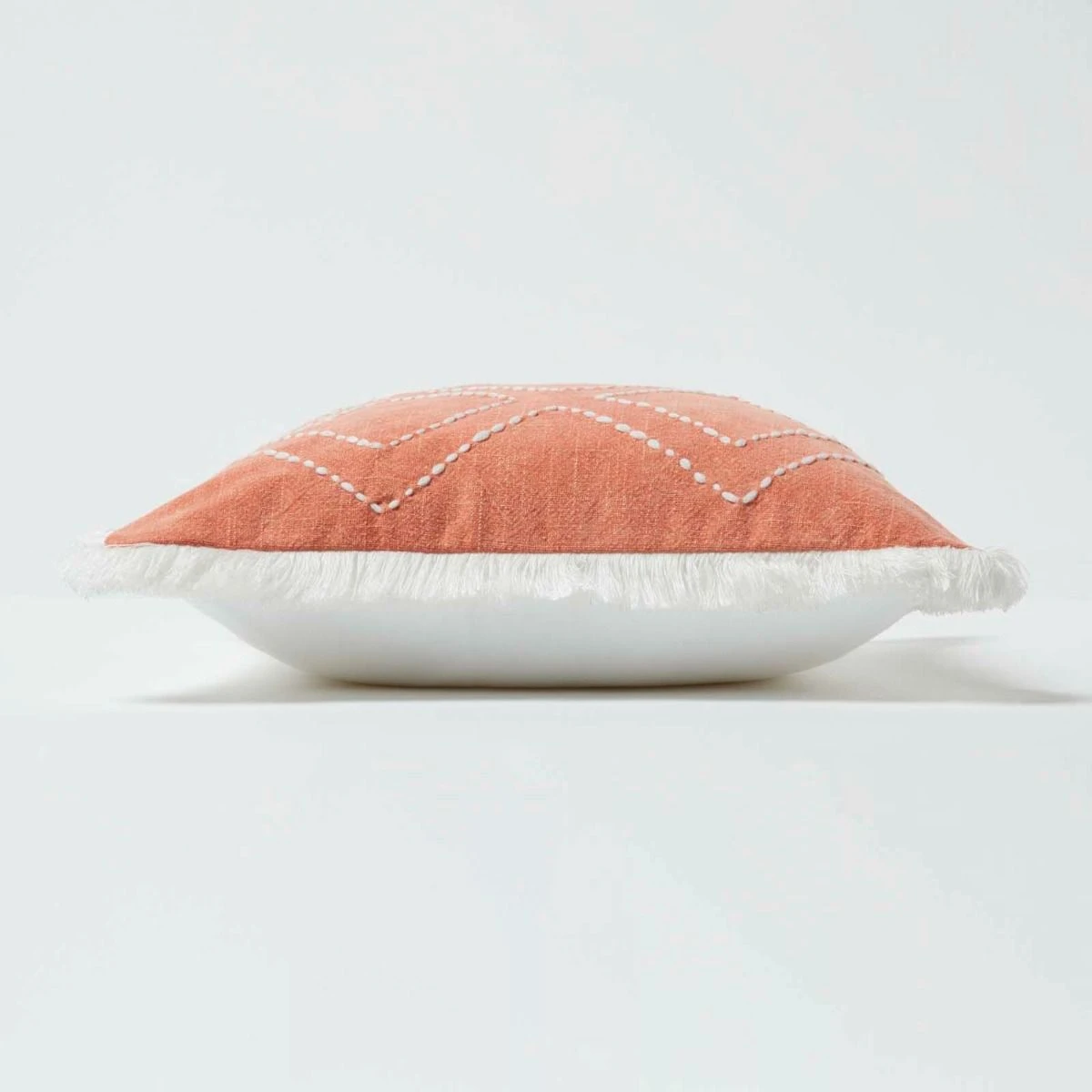 Detailed with white thread and a fringed frame, this embroidered cushion in earthy orange can complement a range of interior styles. Mix and match textures and pair with our luxury cotton cushion covers in a range of earthy tones for a complimentary look.