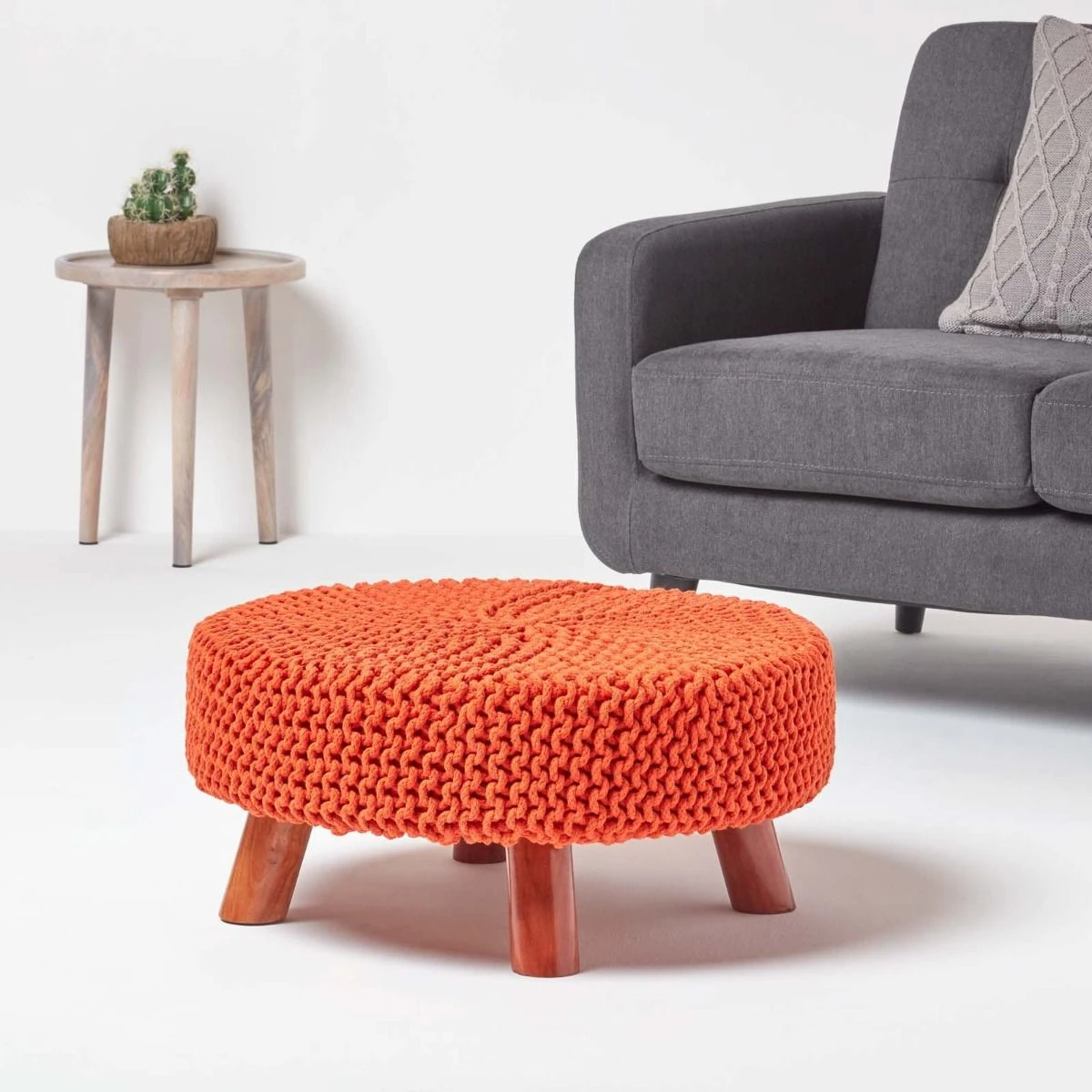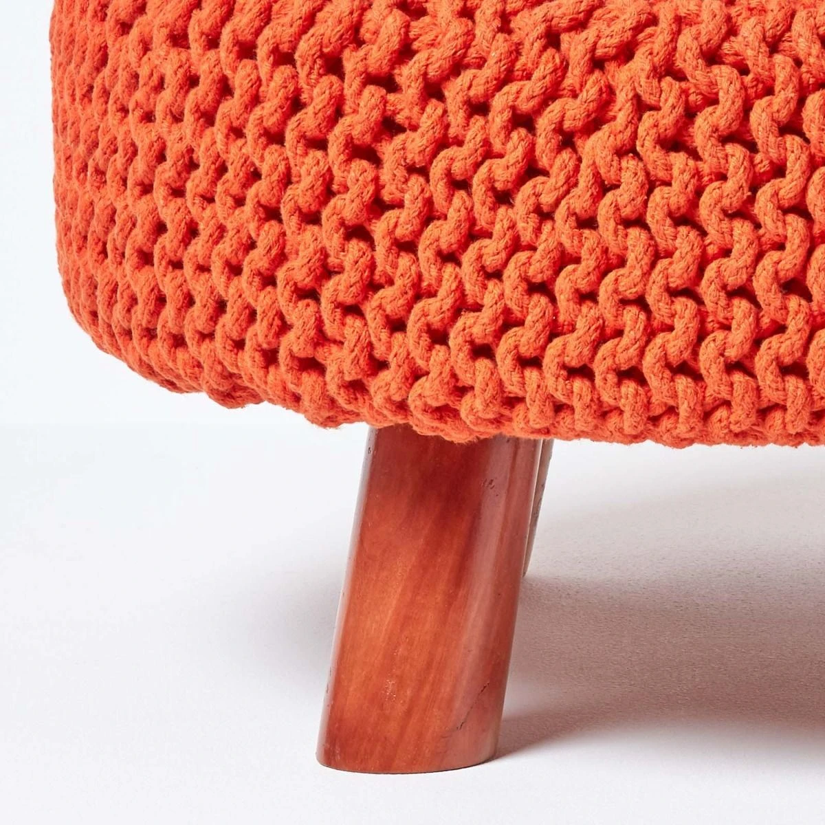 Colourful burnt orange 100% cotton chunky knitted footstool, measuring approximately 30 cm tall and 62 cm wide. Features three wooden legs.