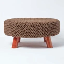 Large circular chocolate brown knitted footstool from Homescapes, measuring 62 cm wide. This footstool has been handcrafted by skilled artisans to create a durable and solid home accessory that you can use as a footrest, occasional seat or small coffee table. In chocolate brown, this footstool will complement neutral interiors.