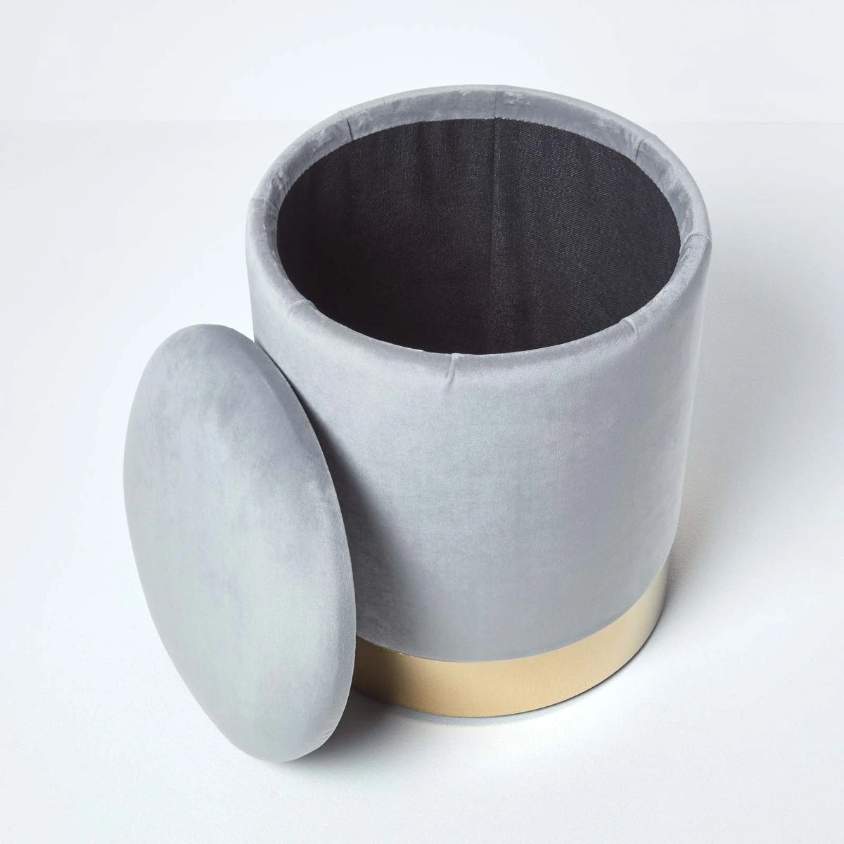 On-trend grey velvet footstool with decorative brass metal base, measuring 38cm tall, this luxury velvet pouffe has internal storage and a detachable lid.