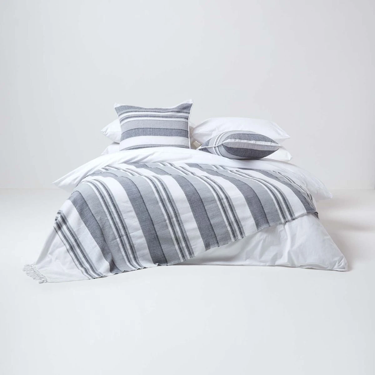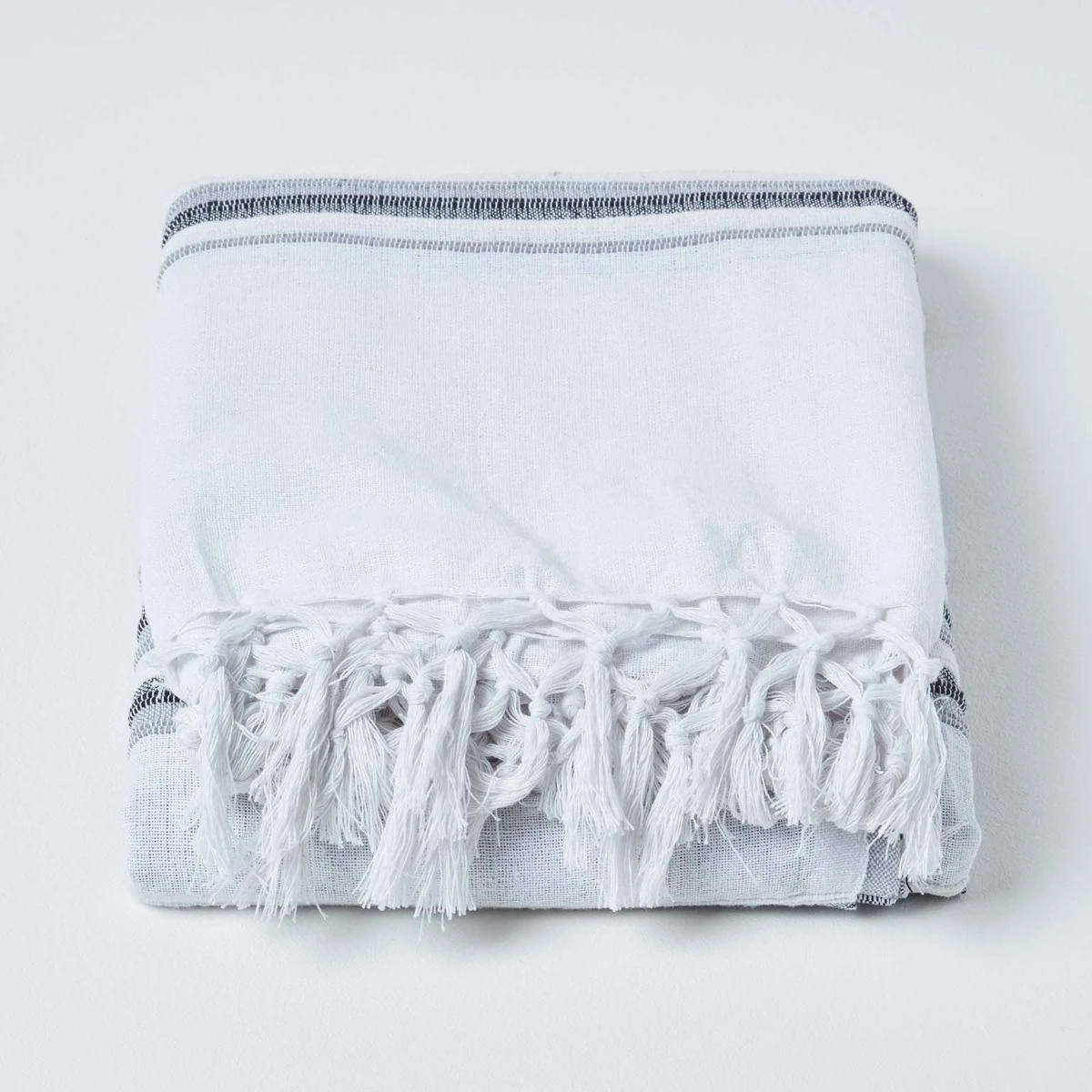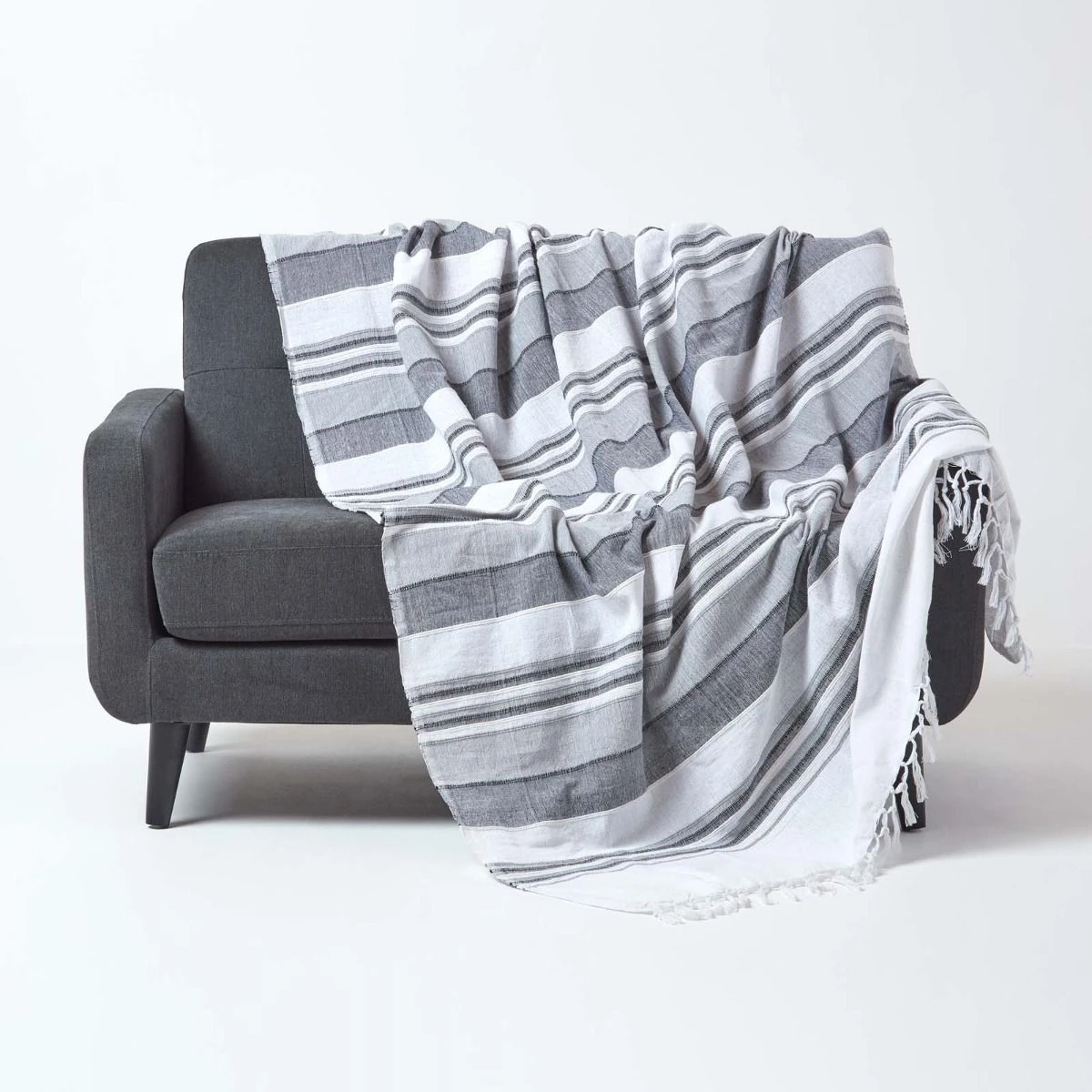 100% Cotton Morocco Striped Monochrome Throw from Homescapes range of soft furnishings is designed to provide a quick and extremely affordable makeover of any room. Manufactured on traditional handlooms the colours of Morocco Cotton Striped Throw range have been chosen very carefully which include the current hot trends and also the evergreen classics. This range includes throws in three sizes, 60 x 80 Inches, 90 x 100 Inches and 100 x 140 Inches, coordinating curtains in 54 Inch and 90 Inch drop and prefilled cushions. Homescapes offers this range in solid colours and in stripes made of graduation of colours. Stripes run parallel to tasselled ends, horizontal across the shortest length.