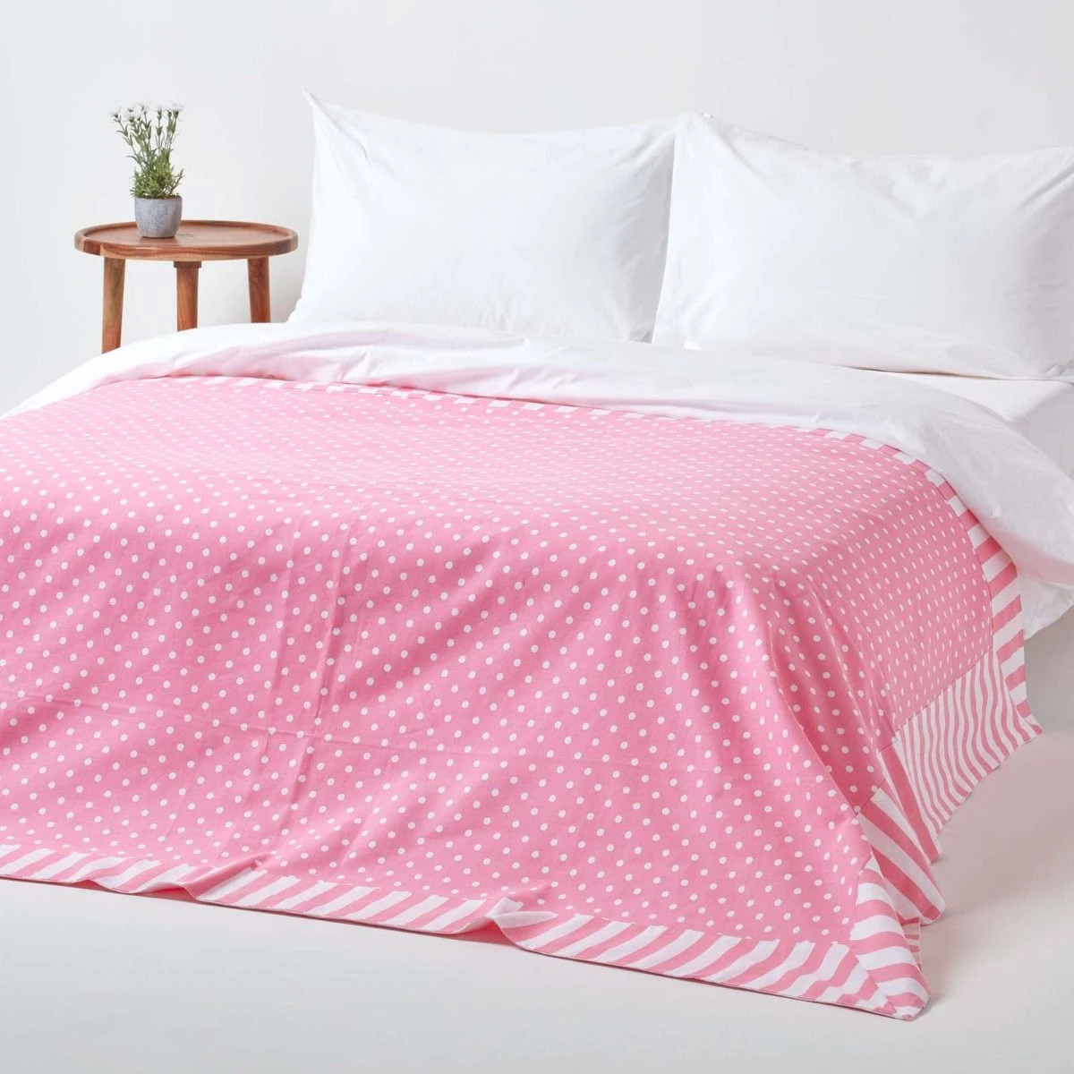 A decorative throw that is ideal to use as a sofa cover, this pink polka dot throw features a striped border for a unique and fun design. Measuring approximately 150 x 200 cm, this throw has been woven from 100% cotton, a strong and durable fabric that can be easily washed and feels soft to the touch.