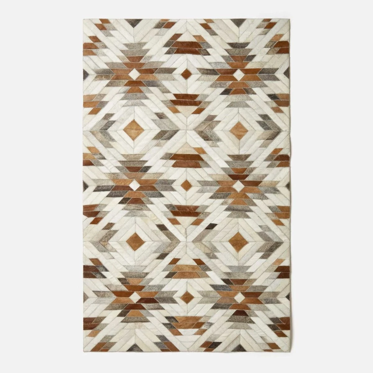 A striking and distinctive rug handcrafted from 100% leather hide and a non-slip backing. A contemporary patterned rug designed to protect your floor in style, while being hardwearing and ideal for heavy footfall areas. Crafted in shades of cream and brown in a geometric design, the leather is carefully cleaned, treated and cut before being woven into this striking rug design. Coordinating leather accessories are also available, including cushions and pouffes.