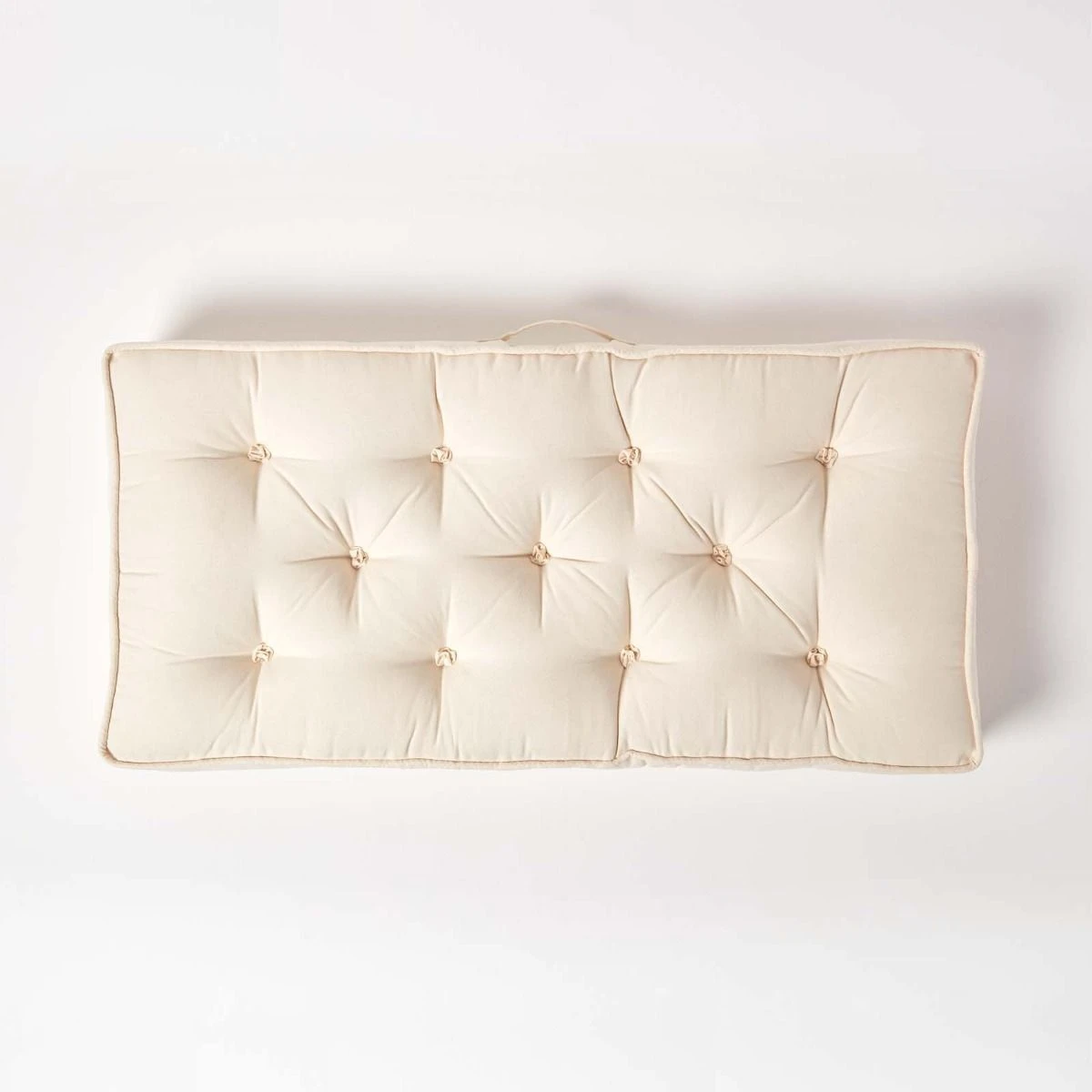 Covered in 100% cotton, our cream 2 seater chair cushion feels super soft to the touch. Designed to last, this booster cushion is generously filled with super polyfibre that retains its shape and firmness. It has a useful carry handle, and is also perfect to use for kids nurseries and bedrooms as a comfortable large floor cushion.