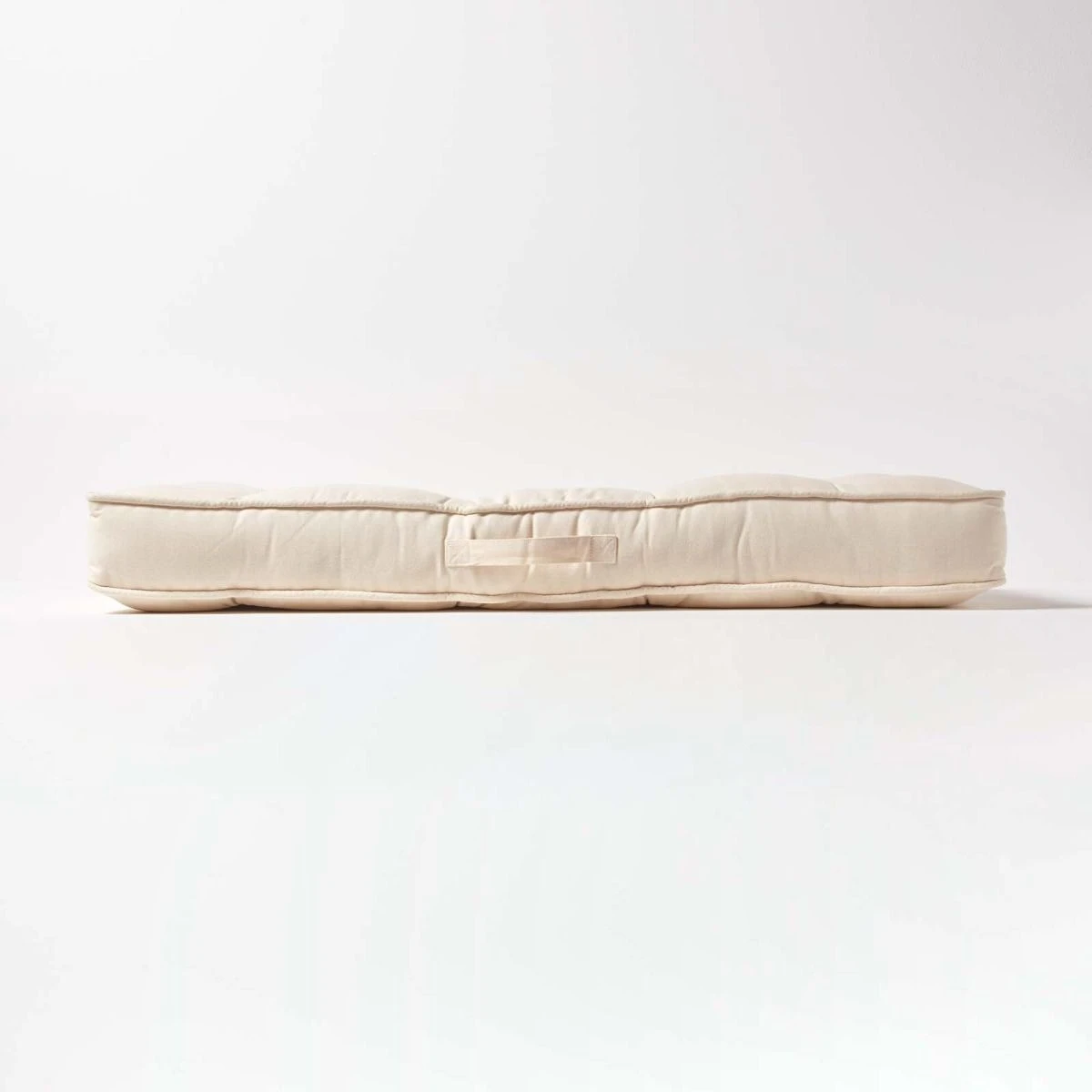 Cream cotton 2 seater cushion filled with polyfibre offering support and comfort. This booster cushion for sofas measures 100 cm wide and features a useful carry handle.