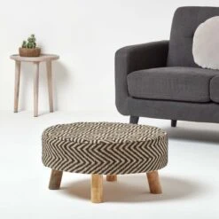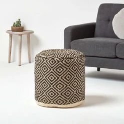 Black And Cream Aztec Style Jute Footstool Beanbag Round 45 X 40 Cm