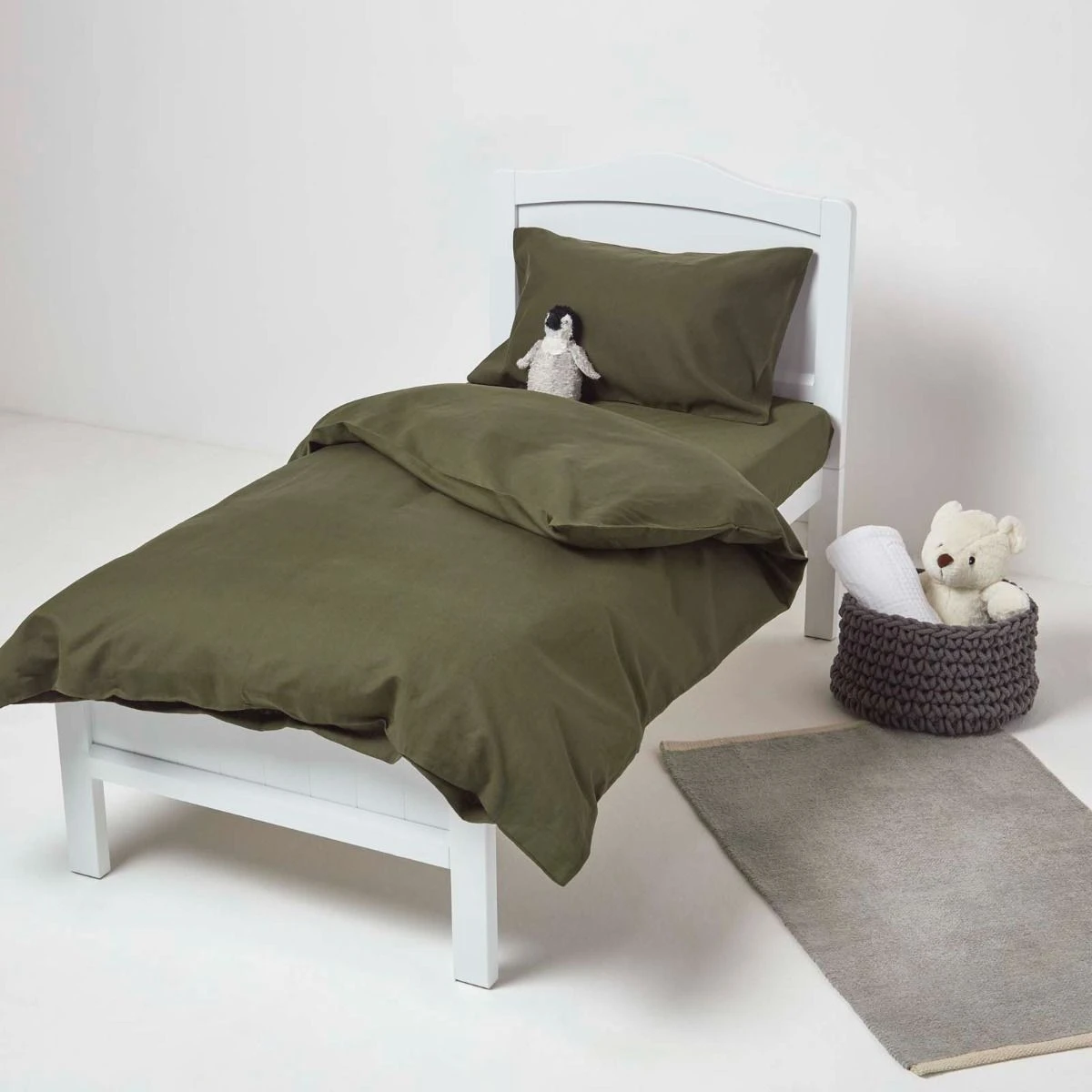 Khaki green deep fitted cot bed sheet from Homescapes’ children’s bed linen range. With a fully elasticated skirt, this child’s cot bed sheet is woven from a premium blend of cotton and linen.
