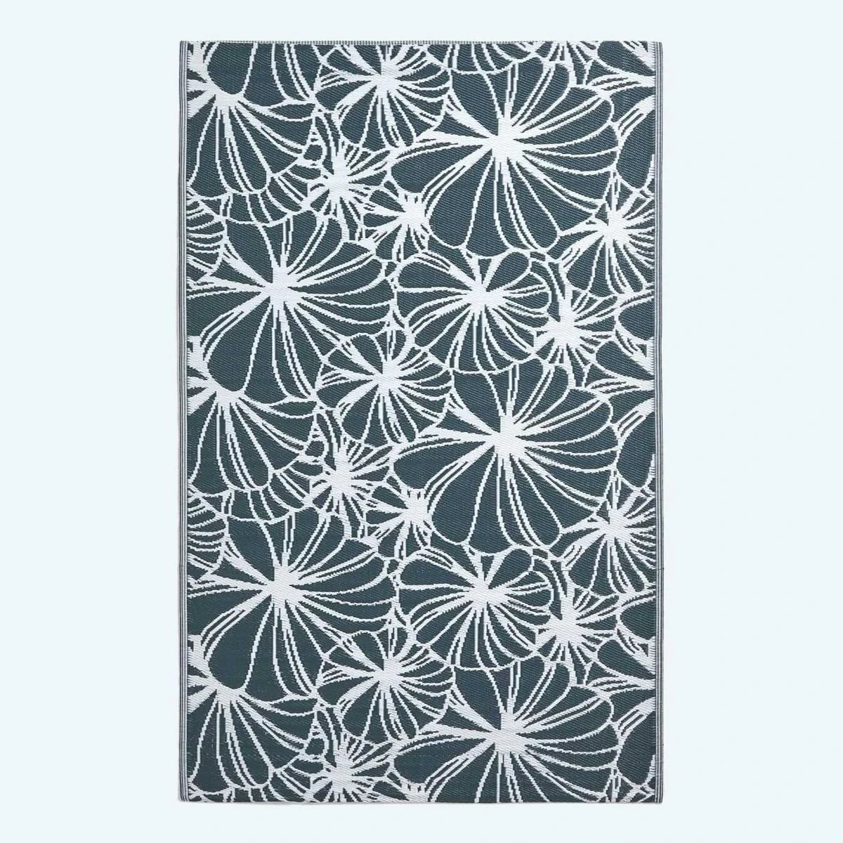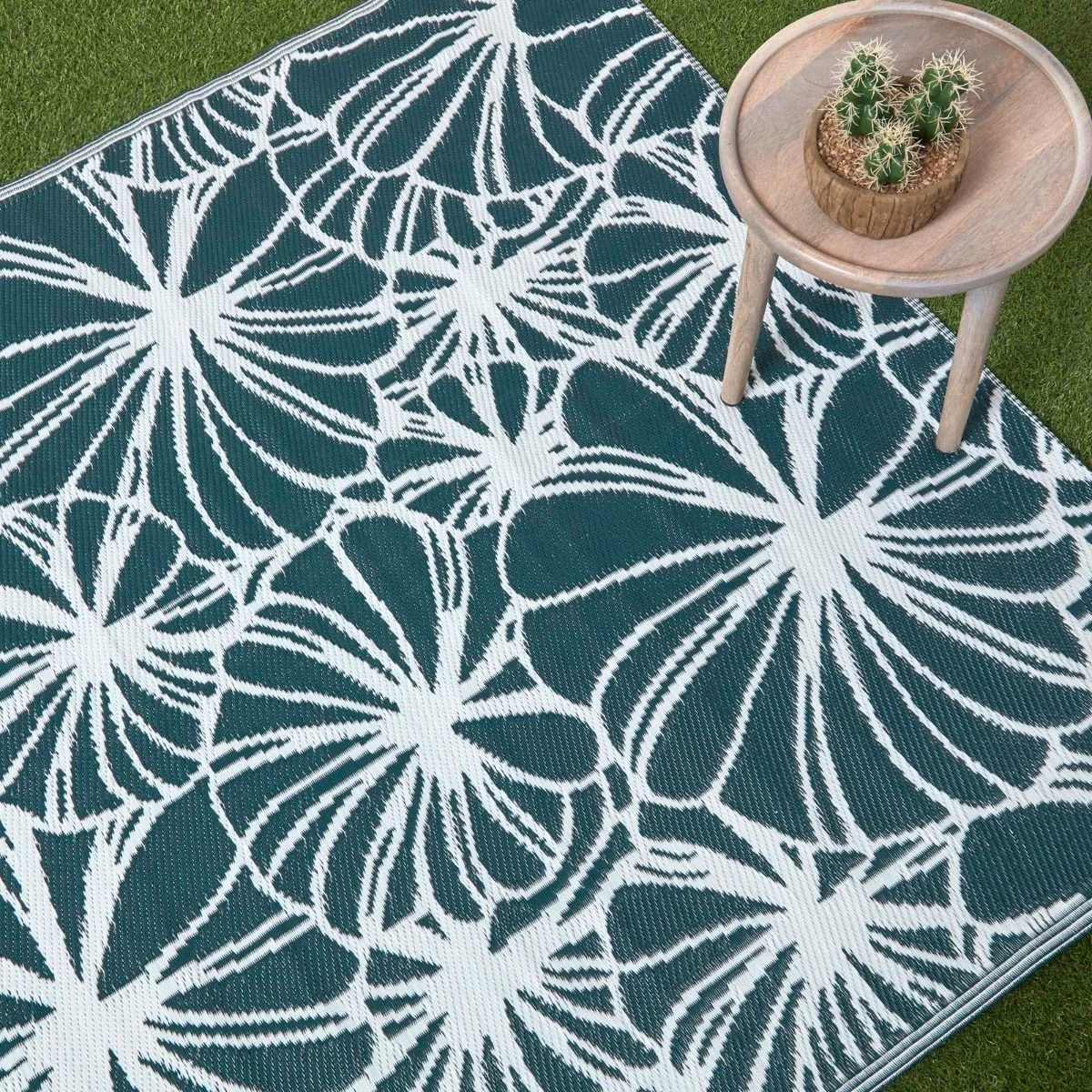 Lilypad style outdoor rug in green and white. Woven from 100% recycled plastic, this reversible garden rug can be used on grass, concrete, decking and more.