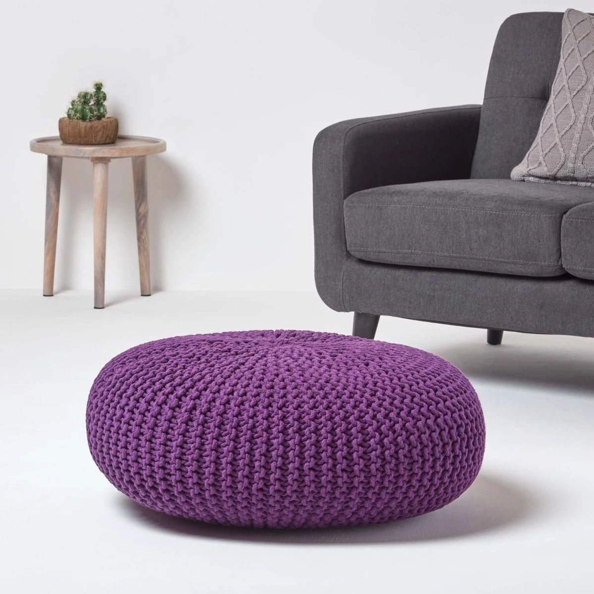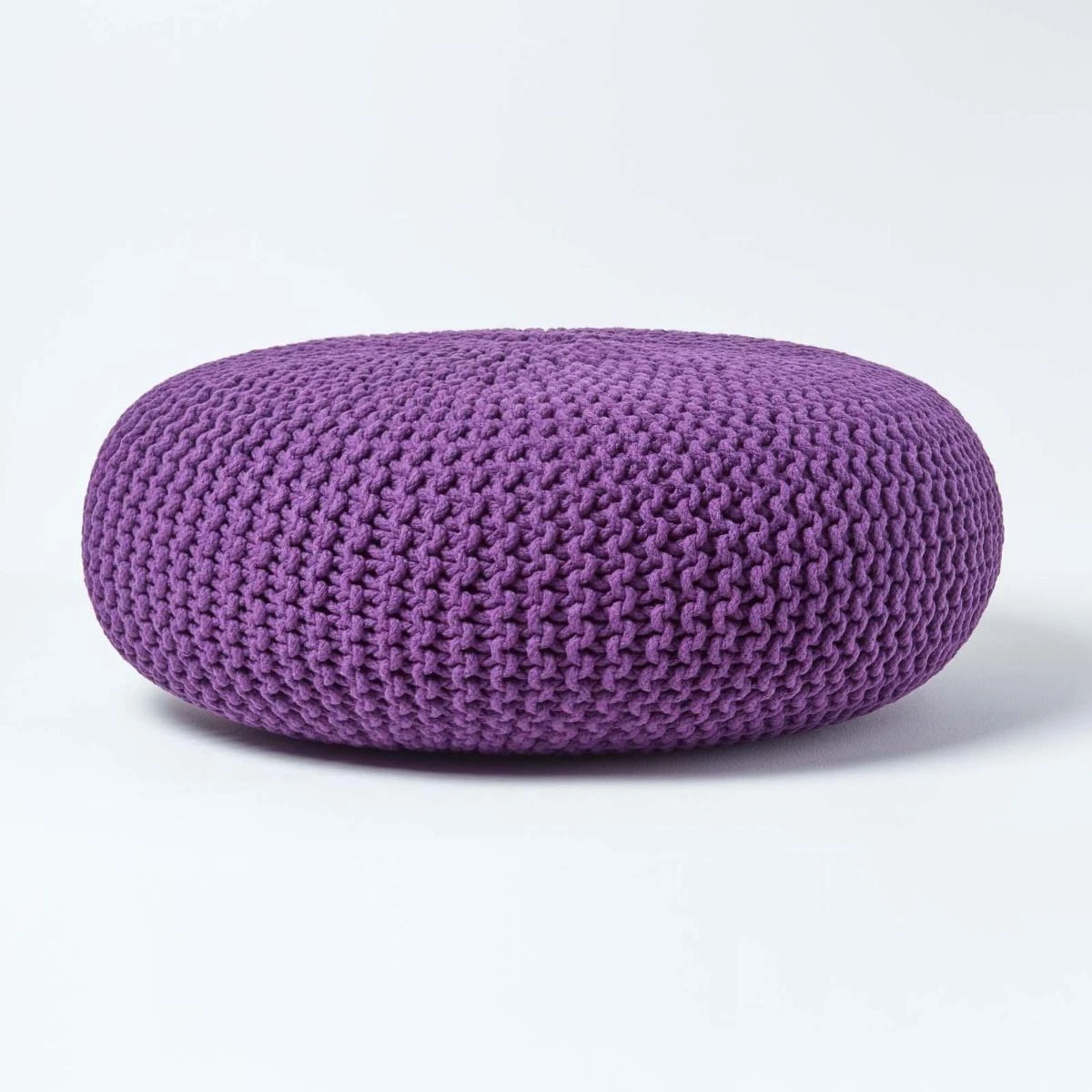 Round and circular dark purple knitted pouffe. Measuring 70cm this flat pouffe or floor cushion can be used as a footrest, occasional seat or coffee table.
