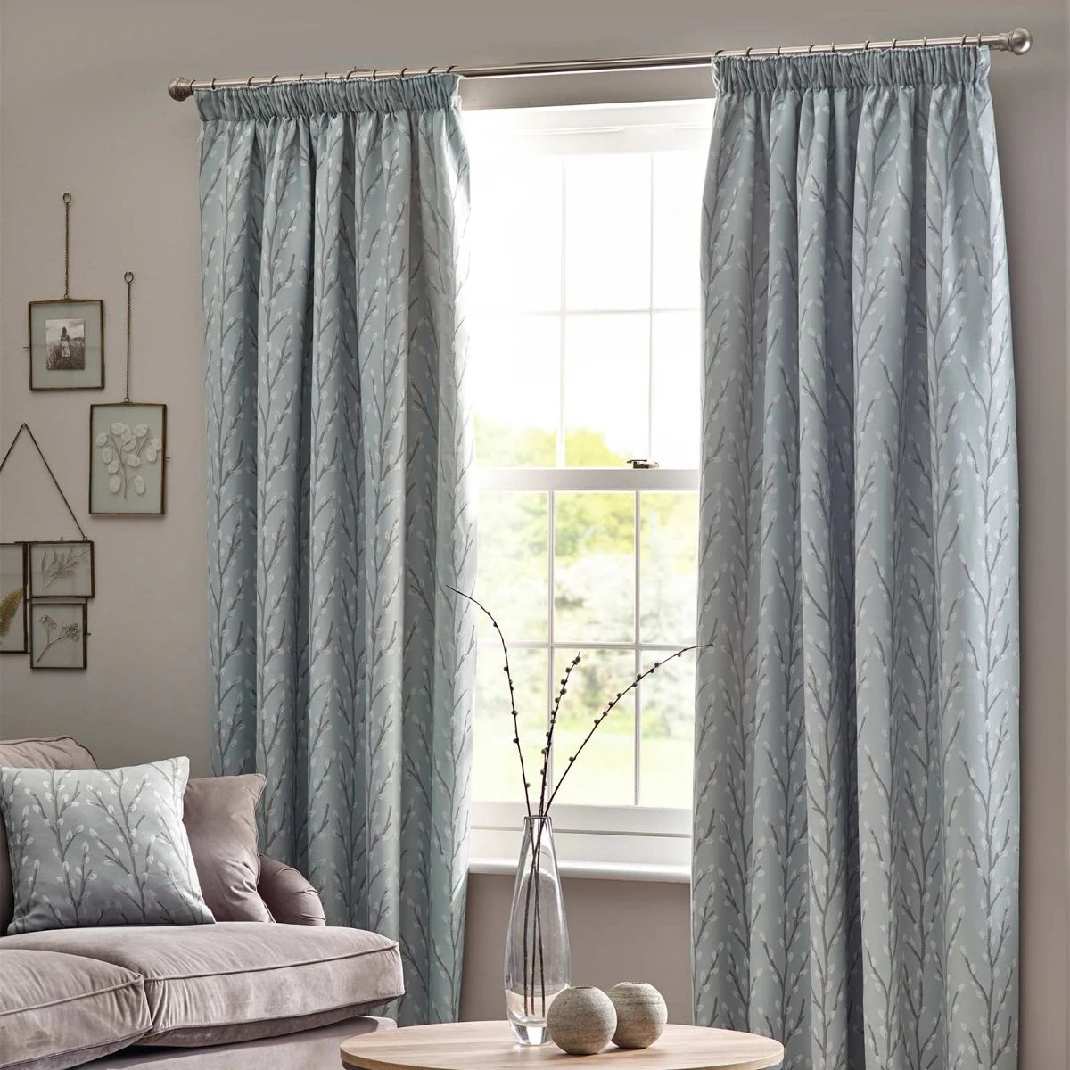 Exclusive fully lined pencil pleat duck egg blue curtain pair in a woven jacquard design for additional texture with a unique pussy willow pattern for an uplifting natural décor.