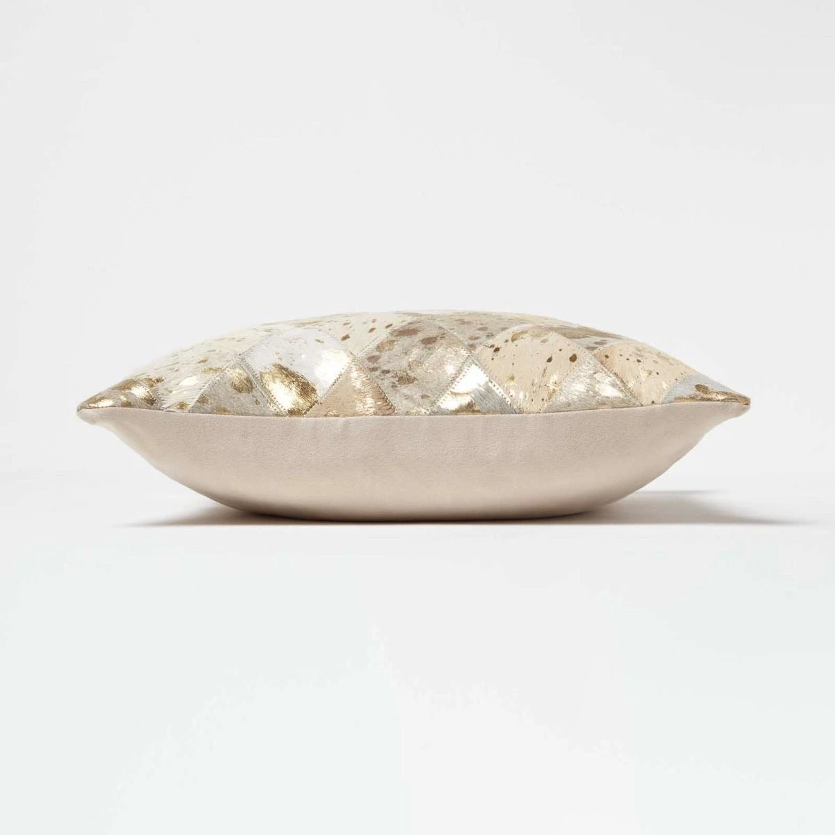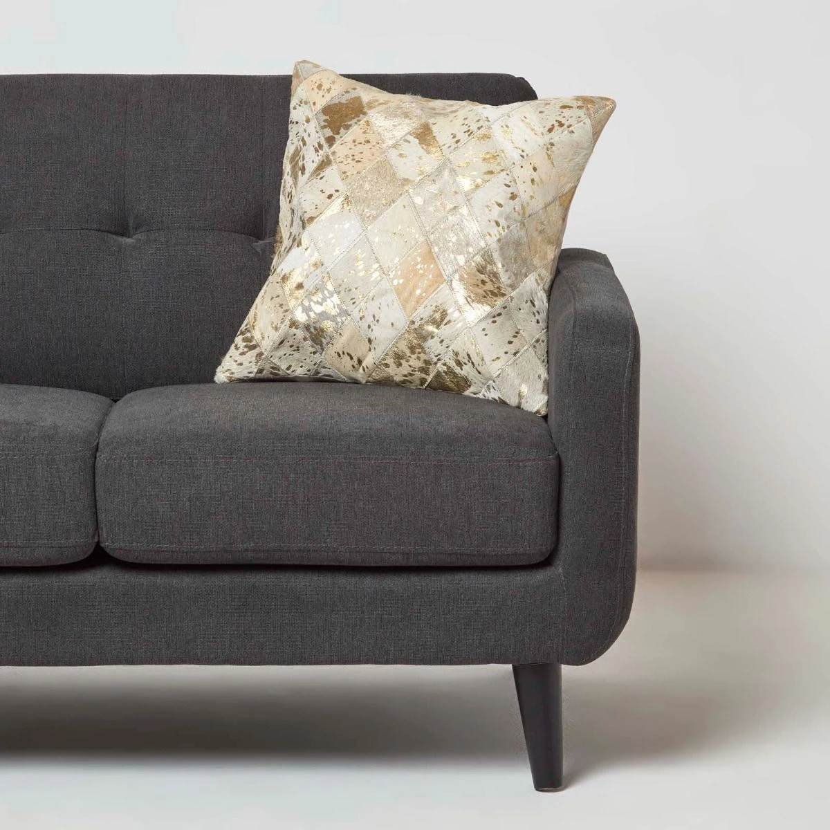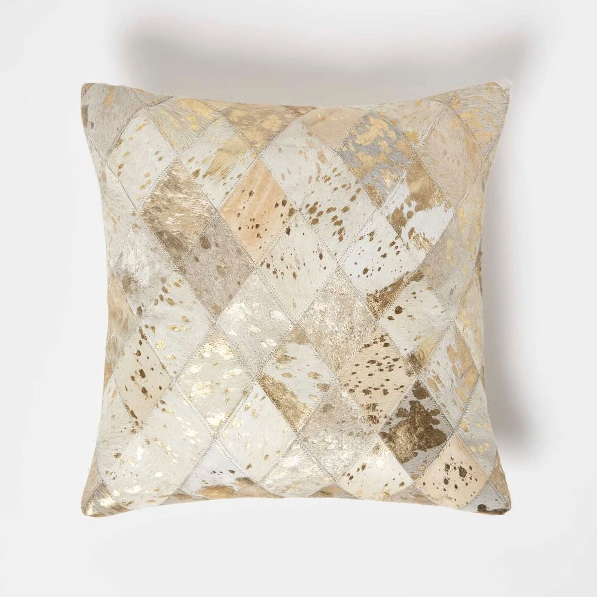 Crafted for comfort and style, this generously filled sofa cushion has a patchwork leather hide front in shades of grey with gold accent colour. A luxurious textured cushion featuring a timeless geometric herringbone design with a plain cream suede reverse. The ideal statement piece for your living space or bedroom, the cushion has been filled with a super microfibre insert for optimal comfort. Due to the natural materials used, these cushions will appear slightly different than the image shown.