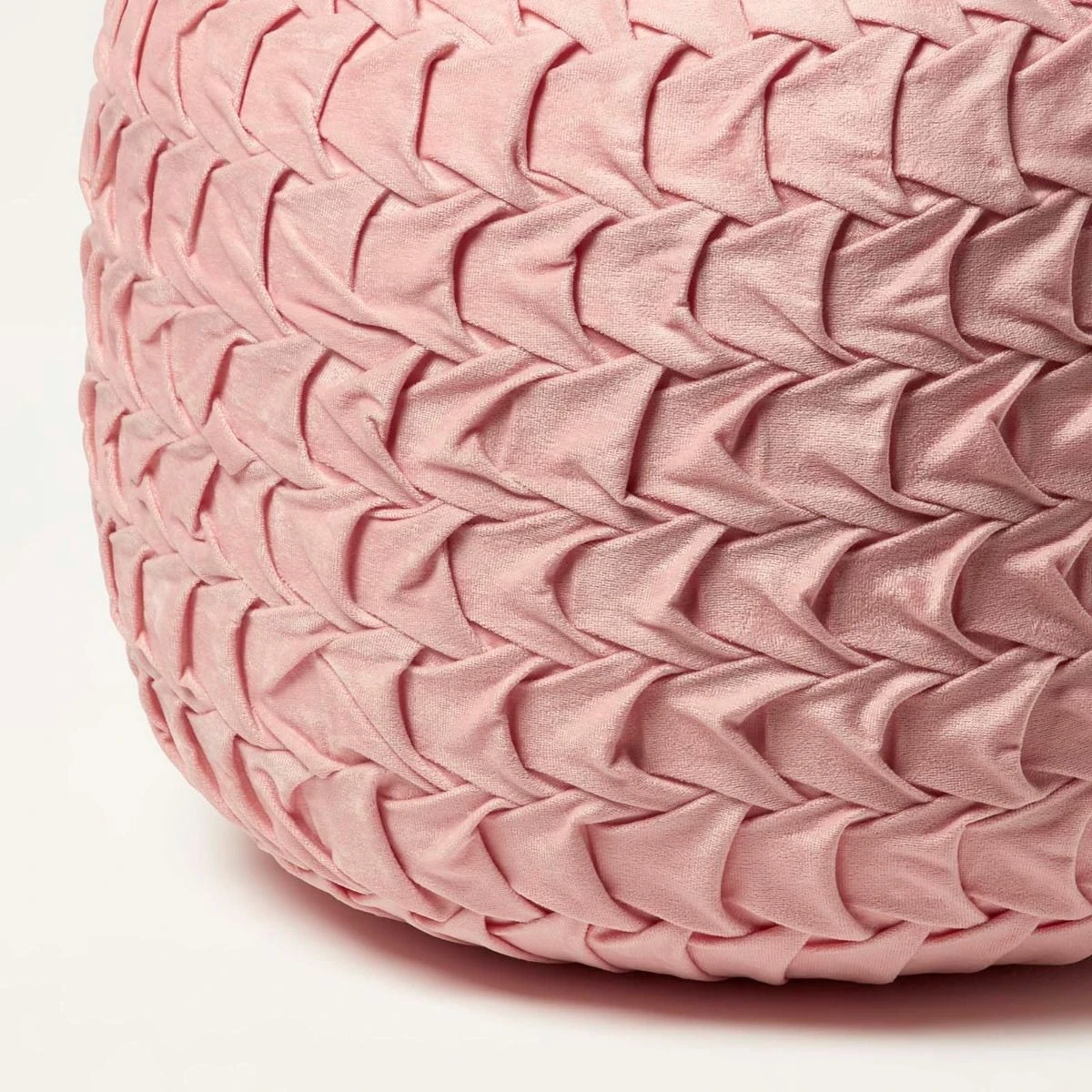Dusky pink pouffe with super soft velvet pleated cover, this pink velvet footstool is generously filled for lasting comfort. 50 cm wide decorative footstool for living room or bedroom vanity.