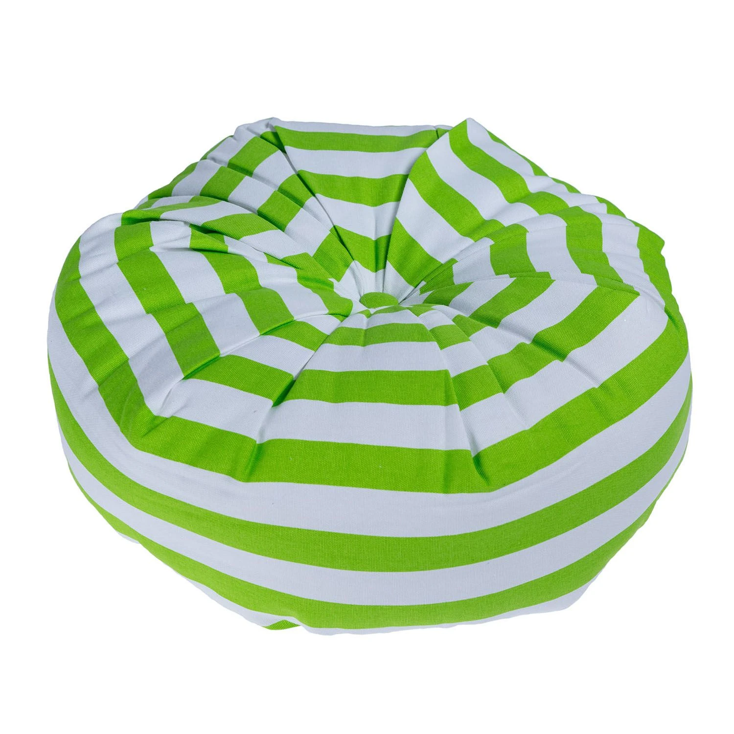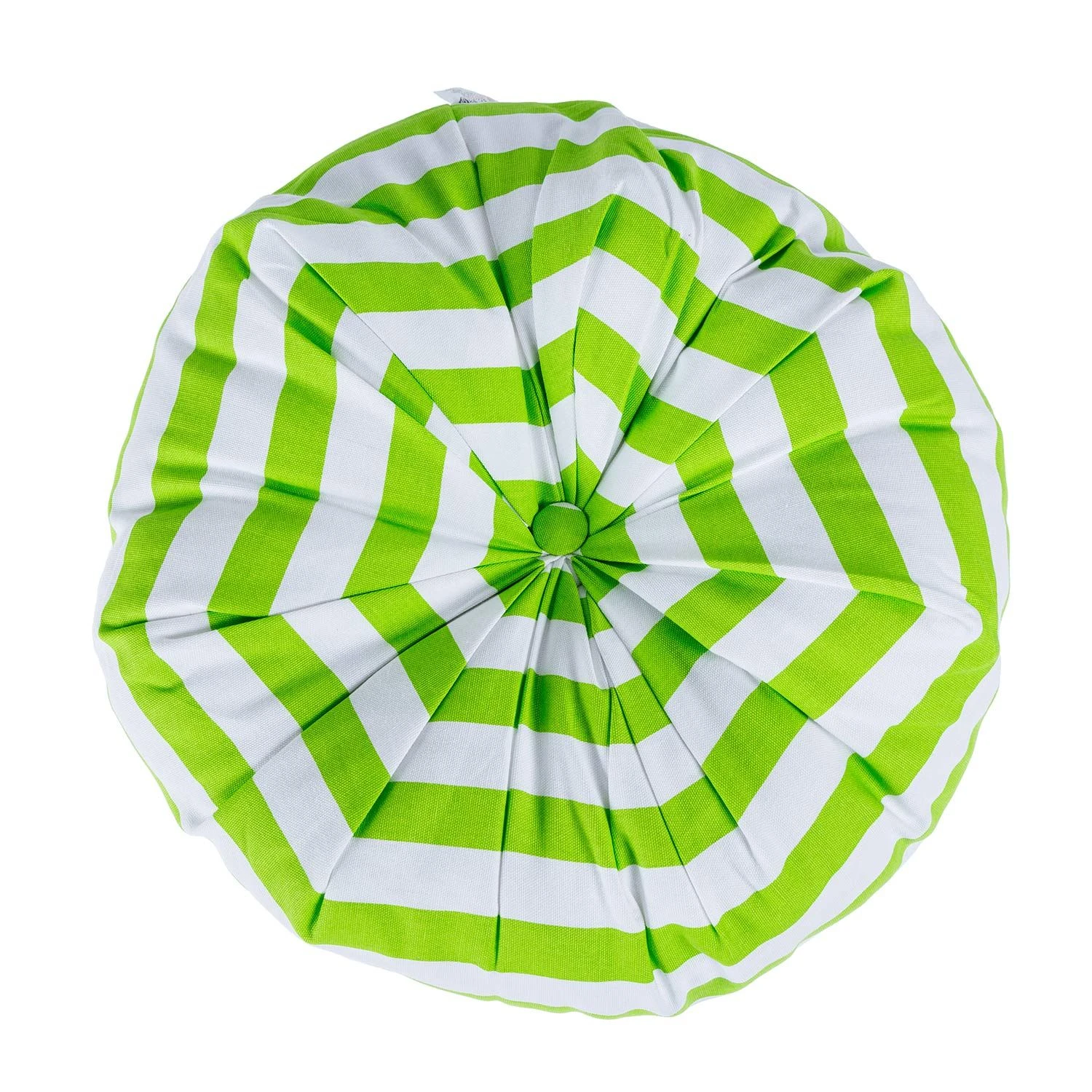 Round pleated floor cushion with green and white striped pattern, suitable for indoor and outdoor garden use, this plump cushion is prefilled with super microfibre.