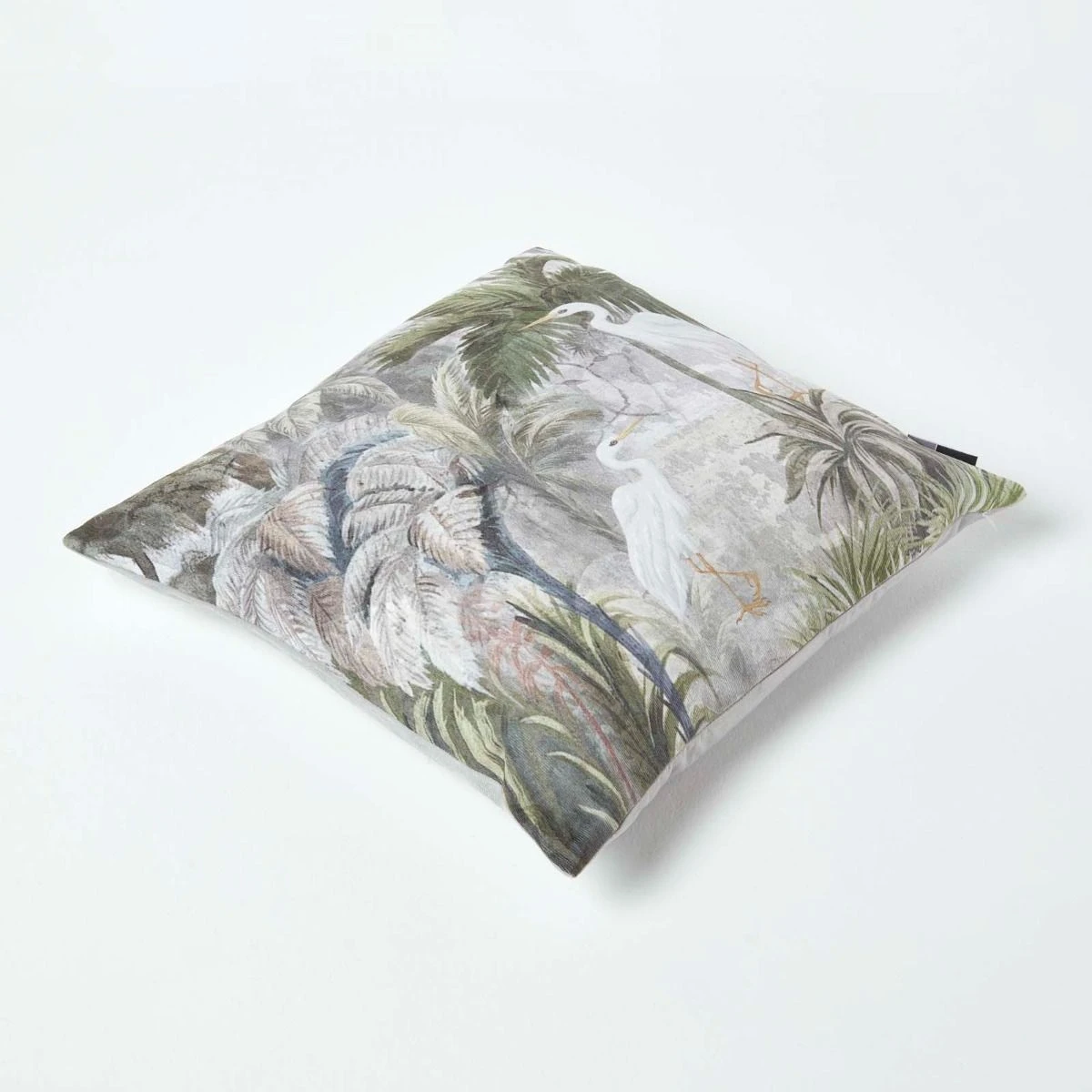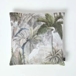 A colourful and striking cushion that will make a statement in any room, this printed crane cushion features 2 lifelike white birds set against a tropical leafy setting. Surrounded by botanical trees and palms, this green and natural cushion will co-ordinate with earthy tones.