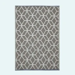 Geometric reversible garden rug designed for outdoor use measuring 120 x 180 cm. Features a geometric pattern in grey and white, can also be used indoors.