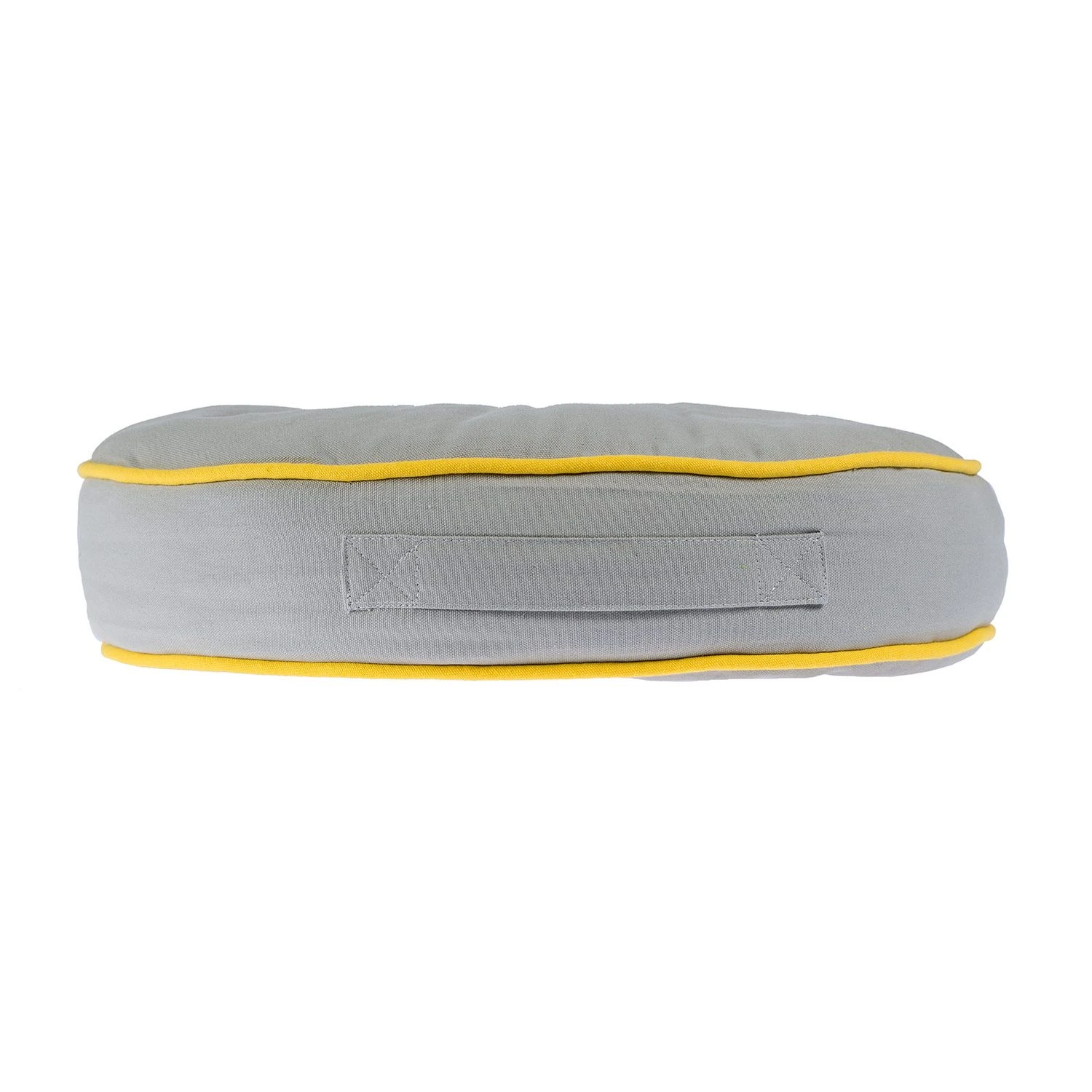 Indoor and outdoor floor cushion filled with super soft microfibre for a comfortable and relaxed sleep, rest or sit down. Covered in a 100% grey cotton fabric, this round floor cushion features 2 button decorations and piping around the edge. Suitable for using at home or taking to picnic on holiday, each cushion features a carry handle for easy transportation.