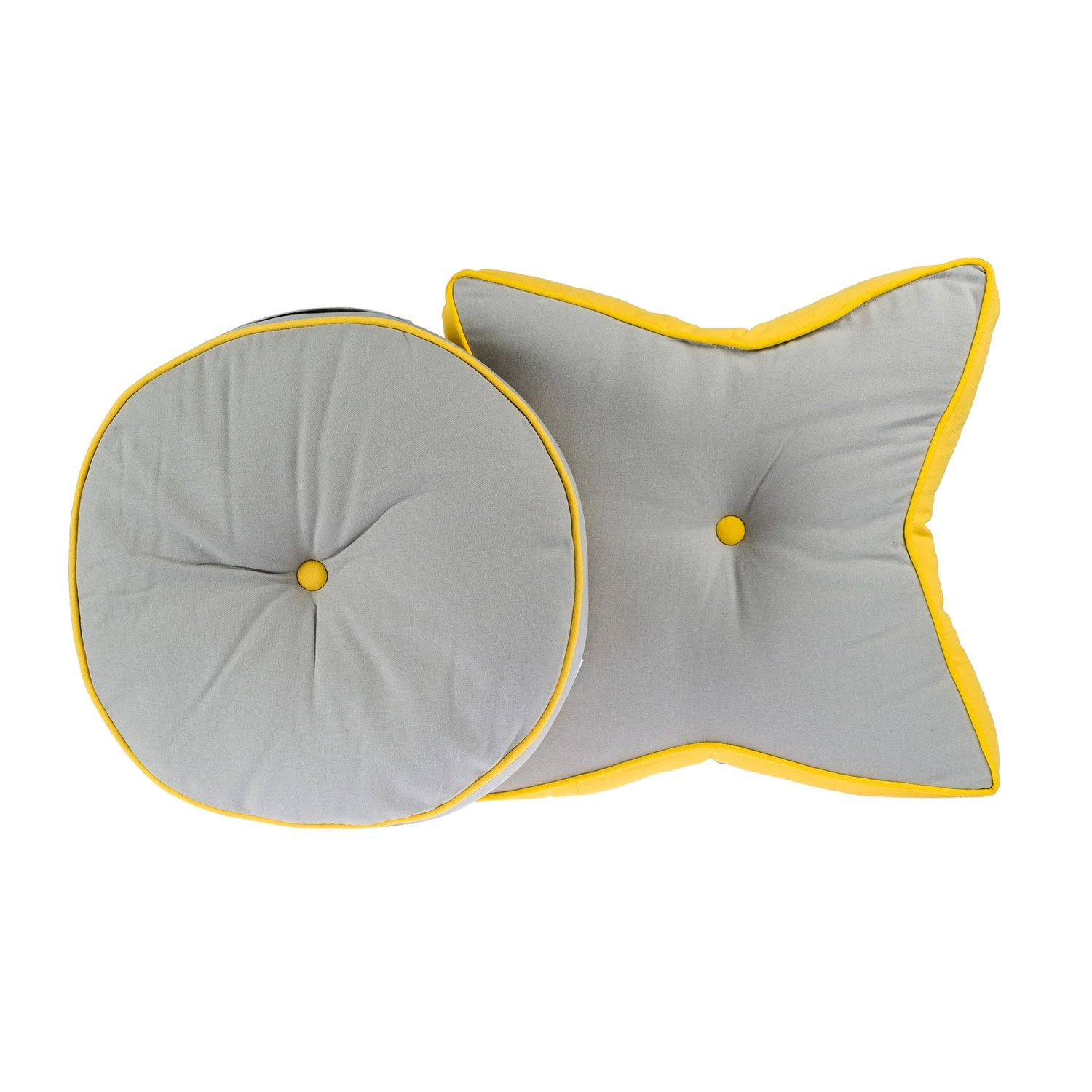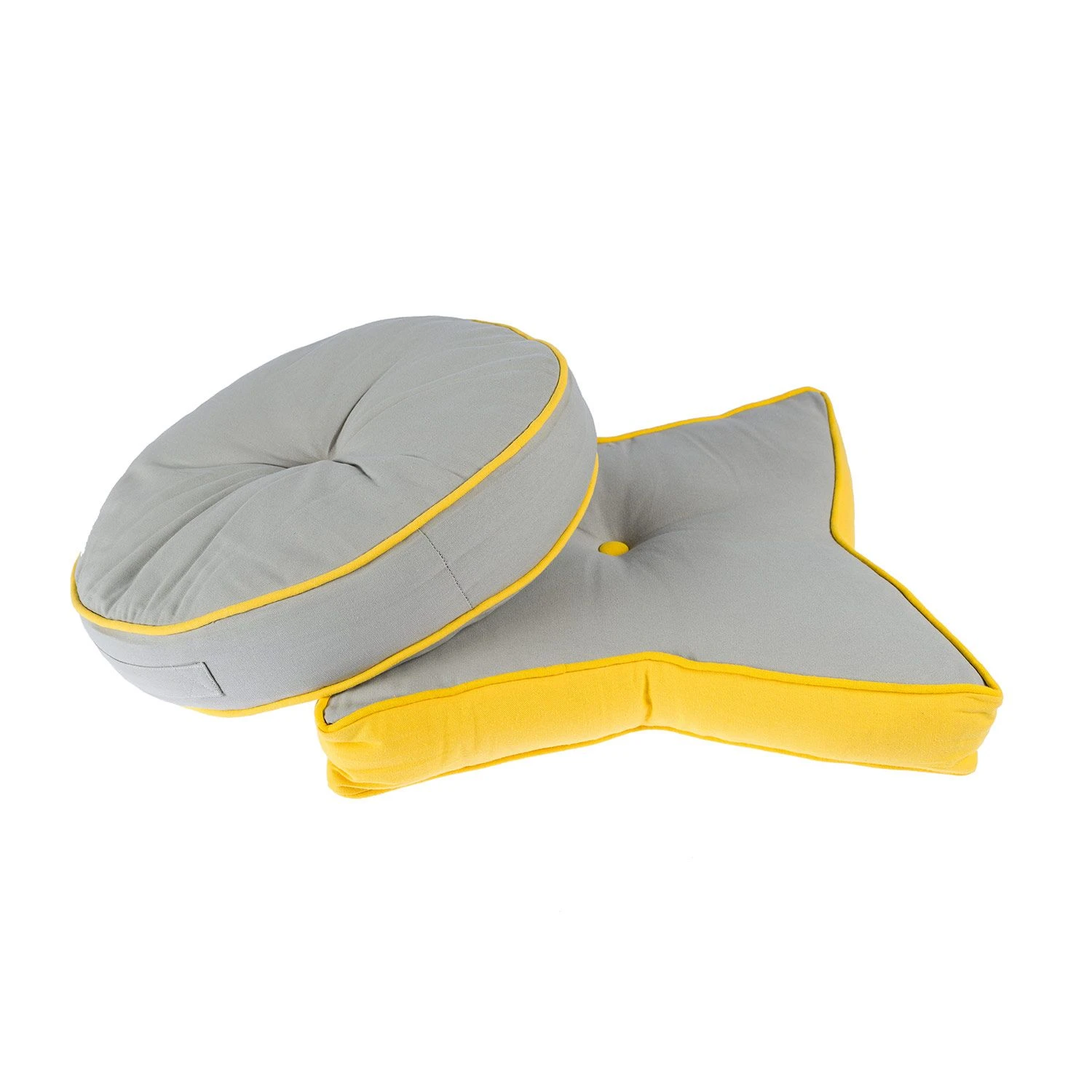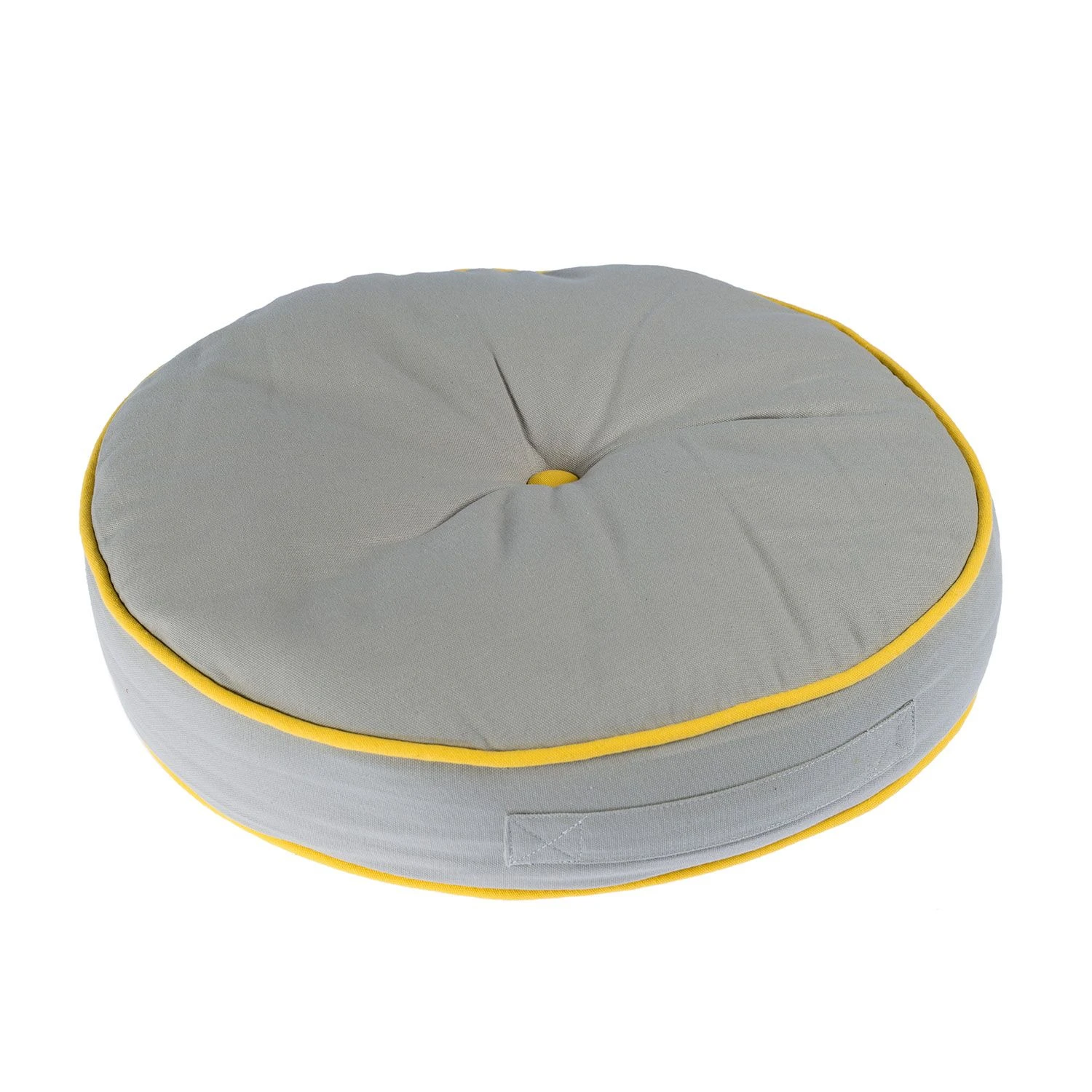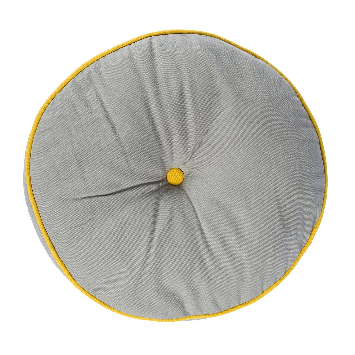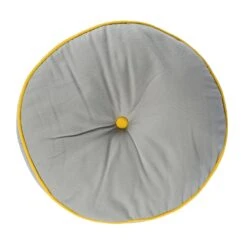 Round grey floor cushion with yellow button and piping detail, 100% cotton indoor or outdoor garden cushion for adults and children prefilled with super microfibre.