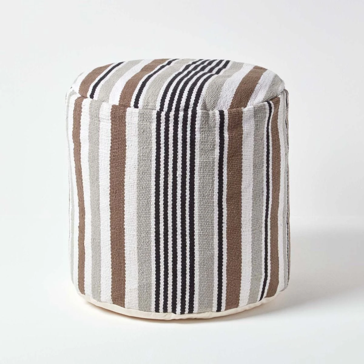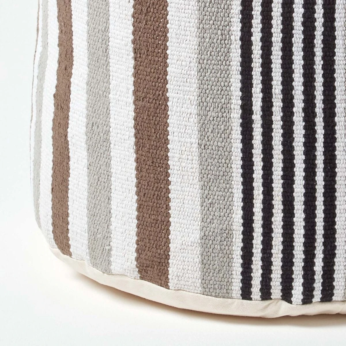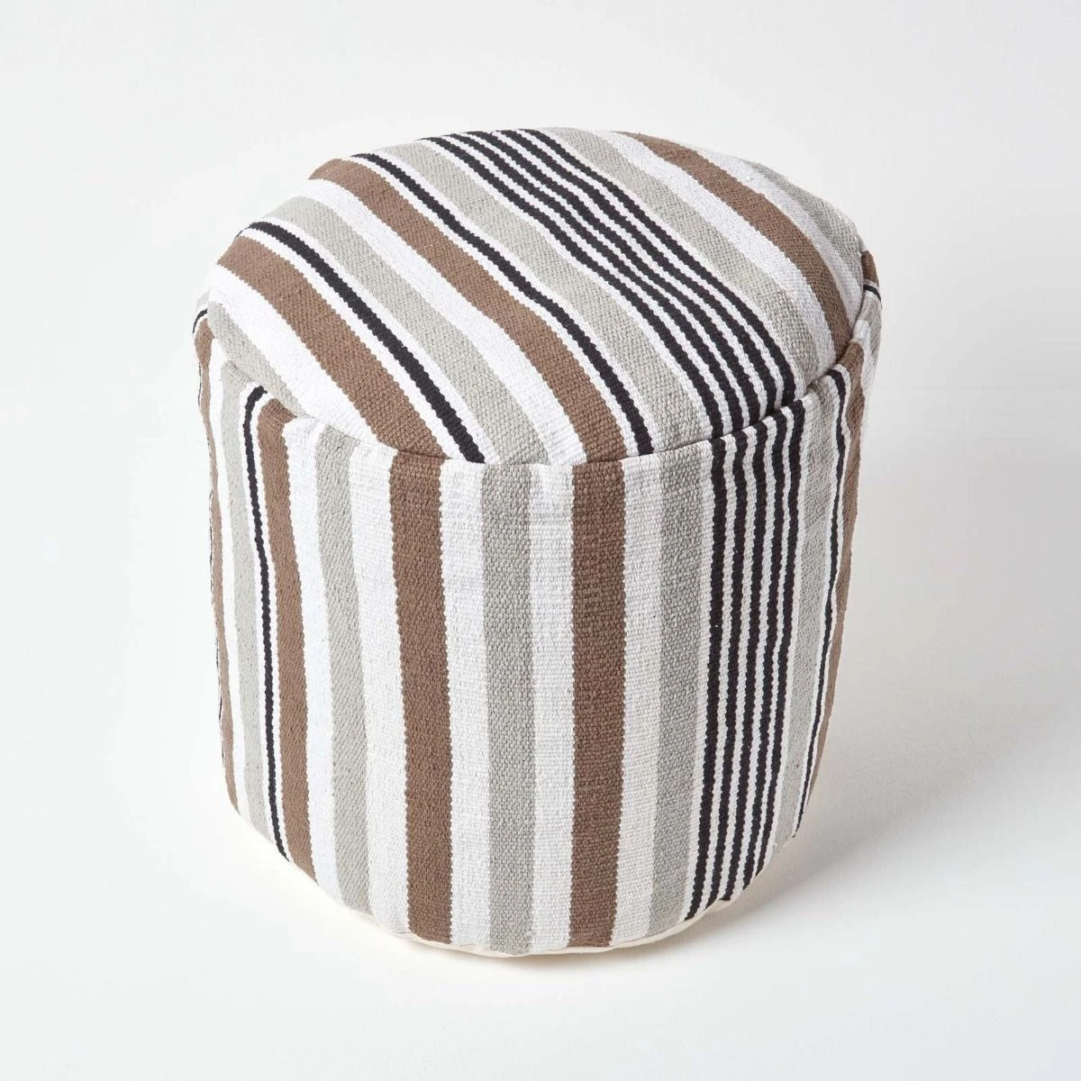 A circular footstool that will had colour and style to any room, Homescapes white, grey and black striped, bean filled footrest is prefilled with polystyrene balls.