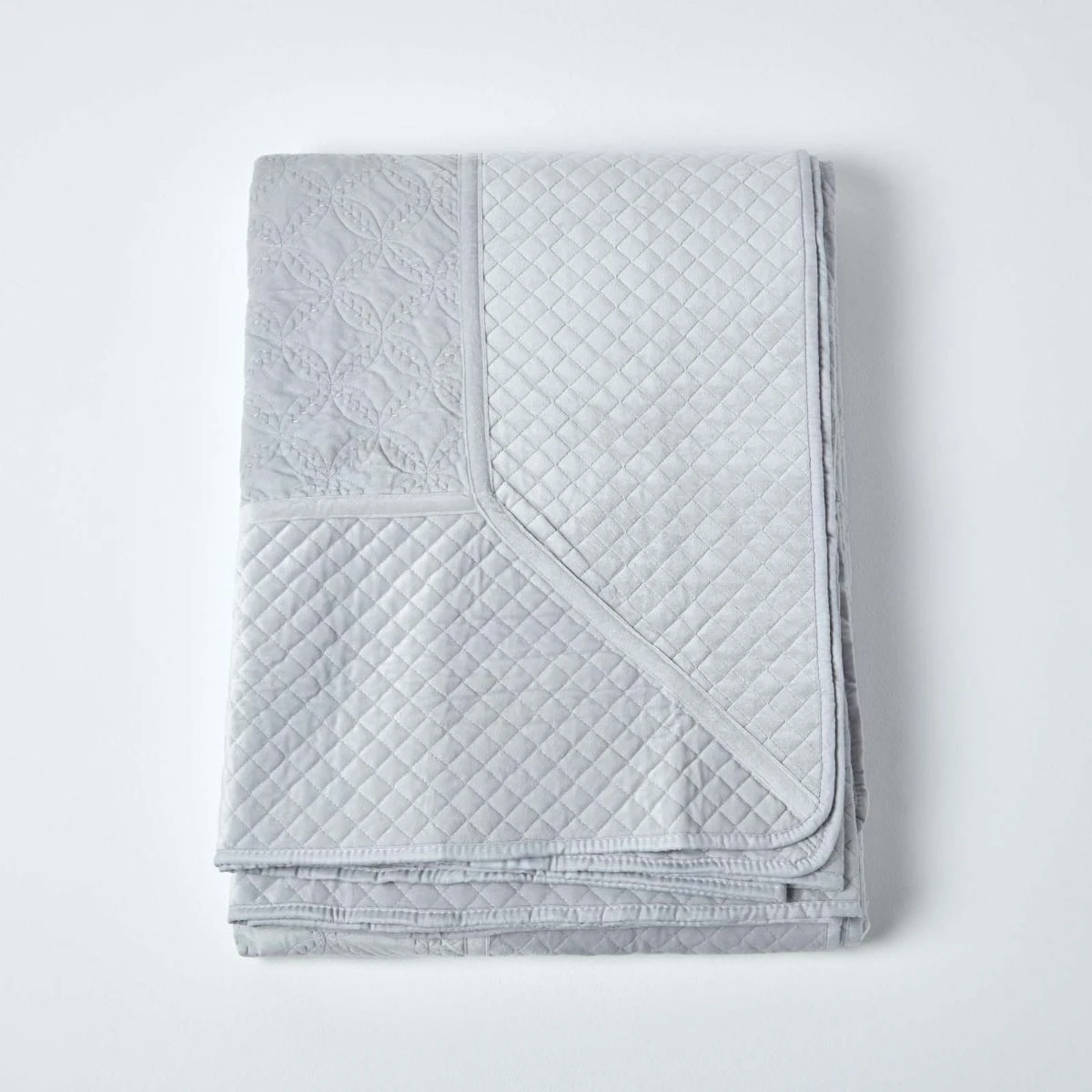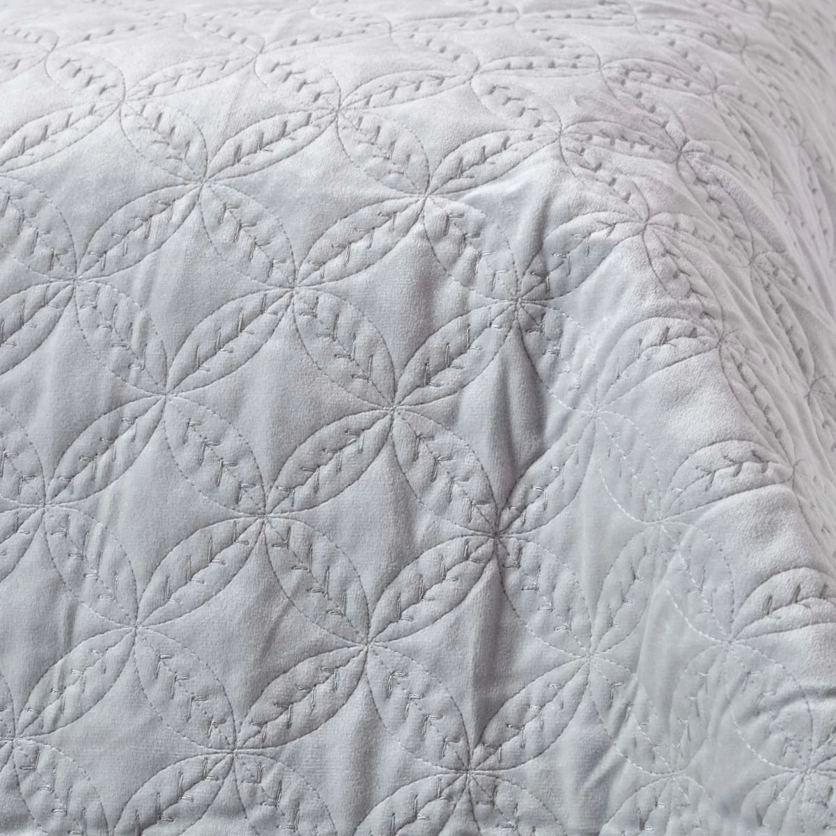 A lush grey quilted bedspread that will add a super soft and luxurious feel to your bedroom. With a geometric quilted style, this soft and luxurious bedspread will add texture and dimension to your home. Embroidered into this throw is a delicate eternity ring pattern adding even more style. Use on your bed as decoration or as an extra layer of warmth during cold night’s.