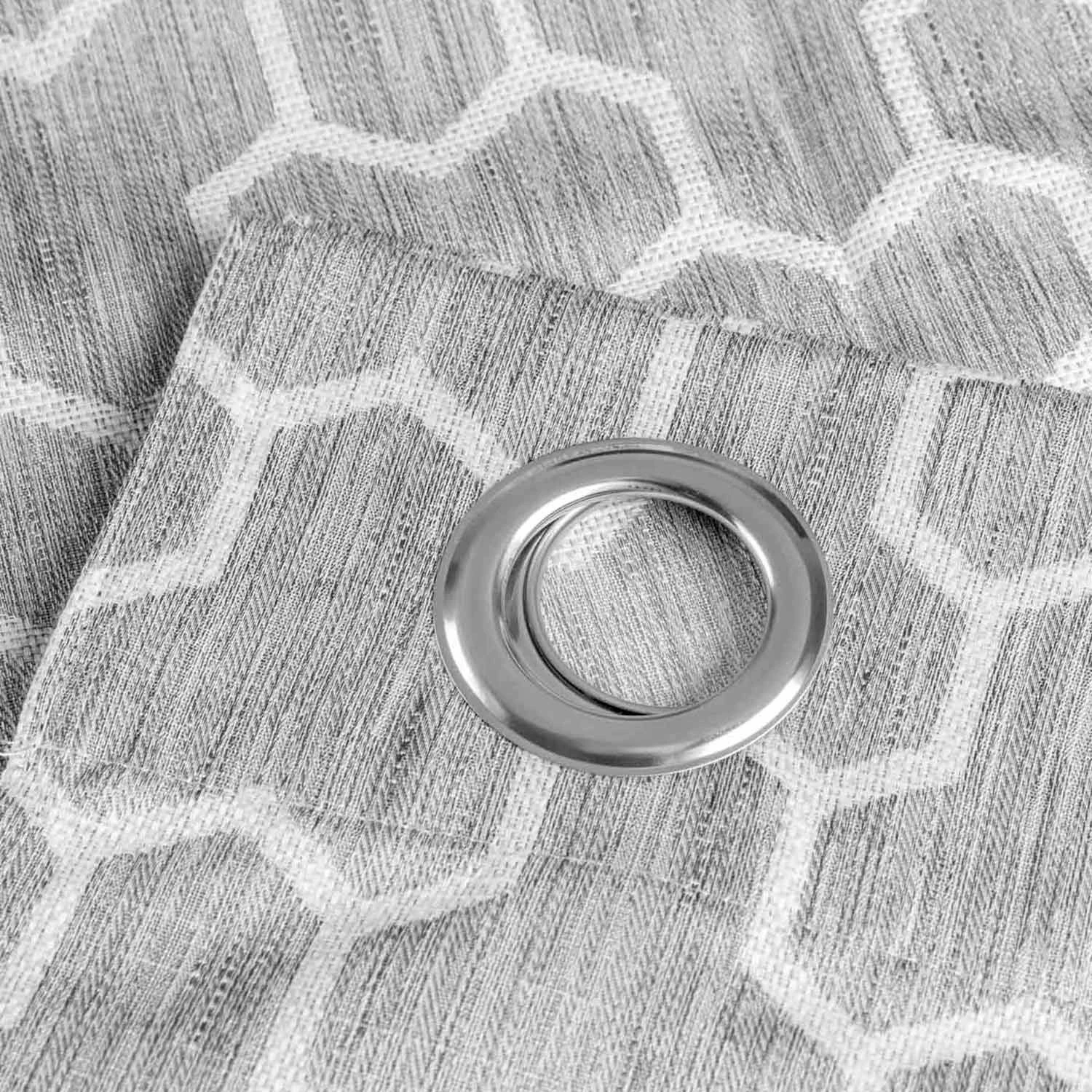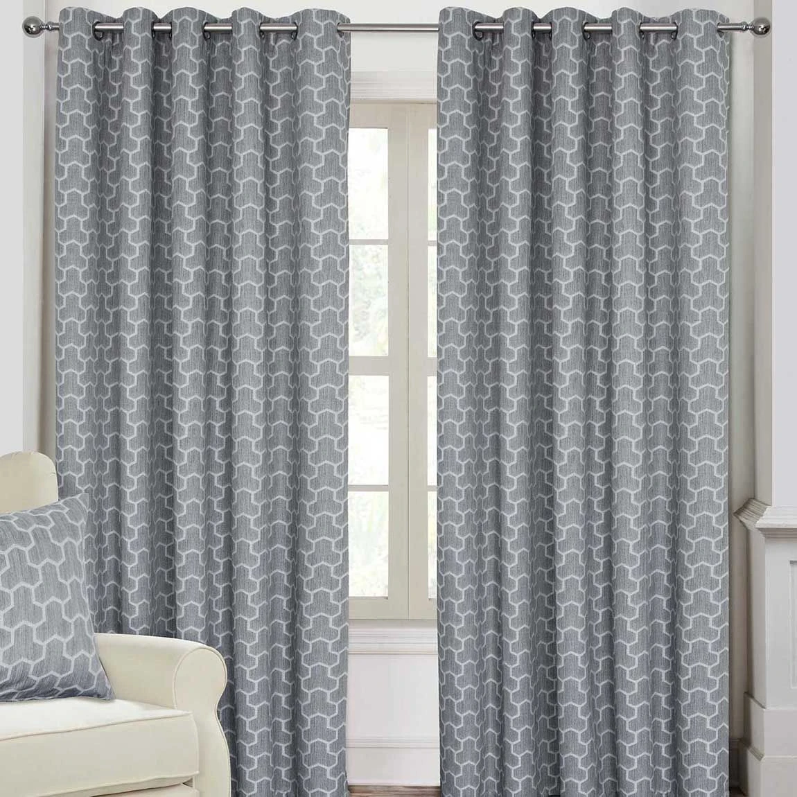 Modern geometric patterned curtain pair from Homescapes with 3 pass blackout coating. These eyelet style curtains come in light grey and are available in a choice of widths and drops.