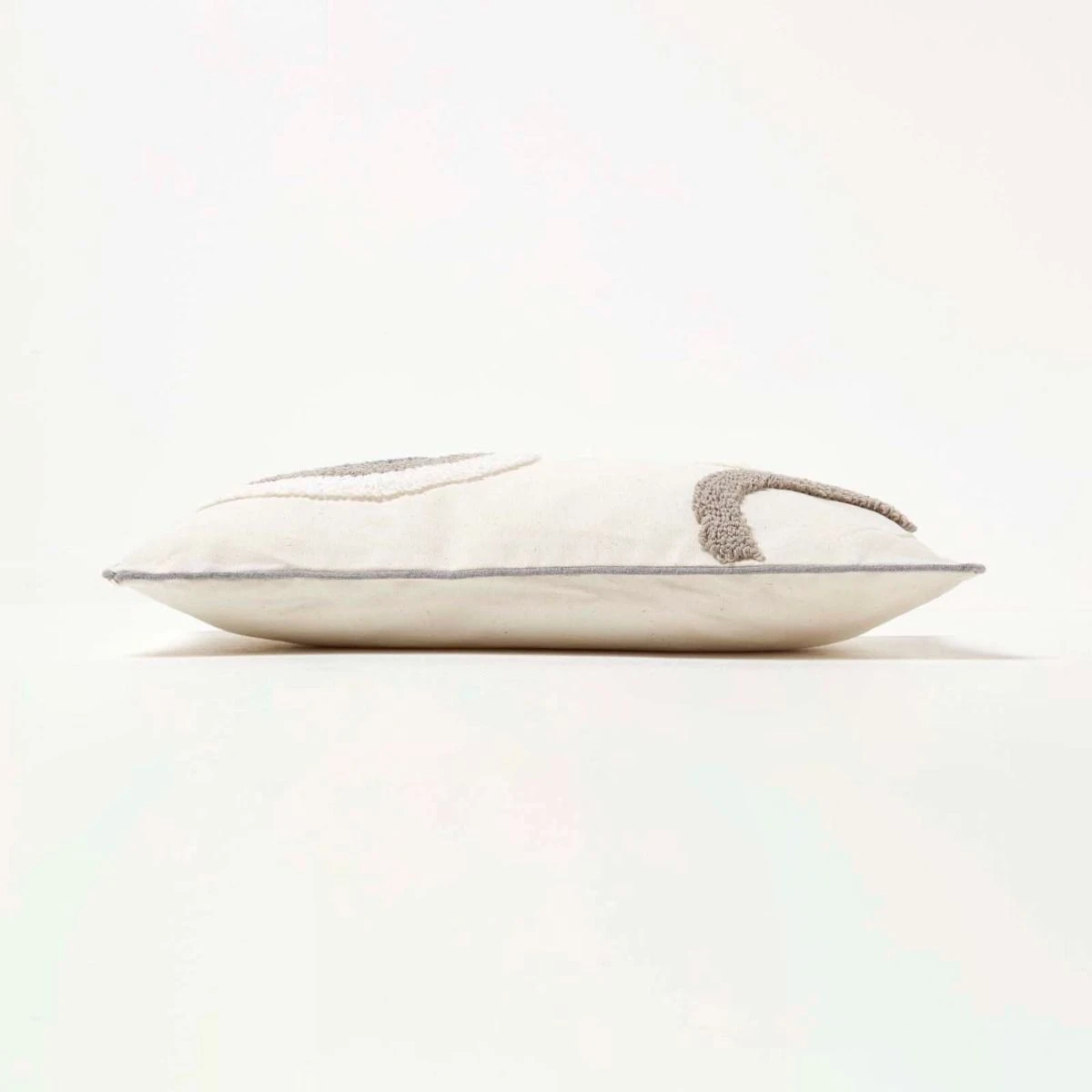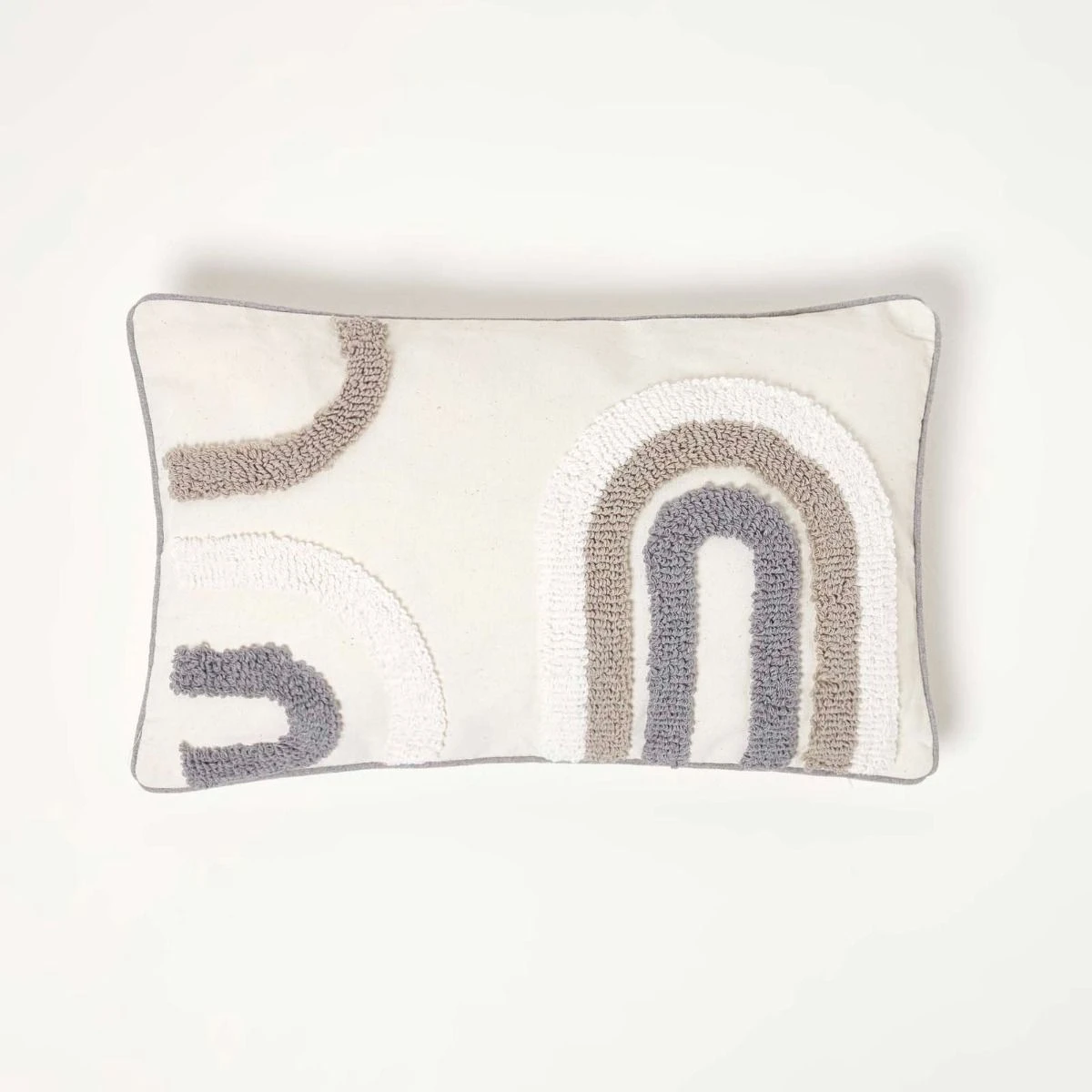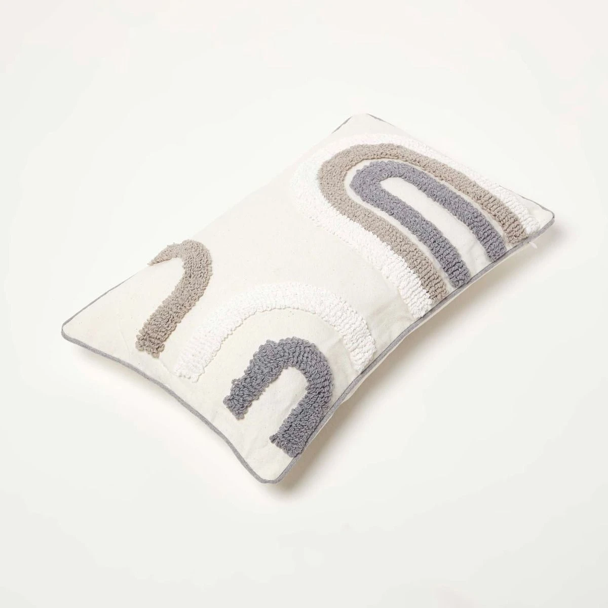 Ruffle decorative cushion by Homescapes. White cushion with grey and white decorative rainbow and a plain reverse.