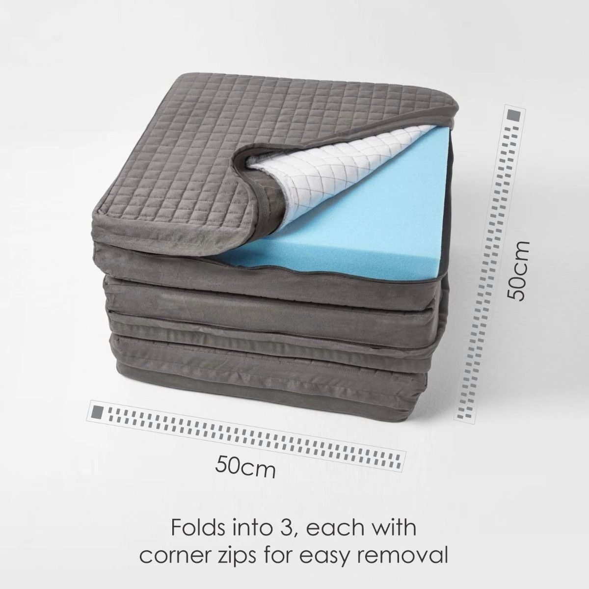 A durable booster cushion designed for everyday use, the firm foam filling is encased within a dark grey faux suede cover that can be easily removed. This soft casing features a square pattern quilting which has been lined with thick and durable polyester for added comfort. Easy to use by all ages, the cover features a compartment for each of the 3 square foam cushions, accessible via a zip running down 2 adjacent sides. The cover can be easily removed and washed and the foam re-inserted, keeping your booster cushion clean and fresh. Easy to transport, each booster cushion has a handy carry handle, the cushion can also be folded away when not in use. Part of Homescapes removable cover booster cushion collection, this booster cushion collection includes 2 seater and armchair size support cushions.