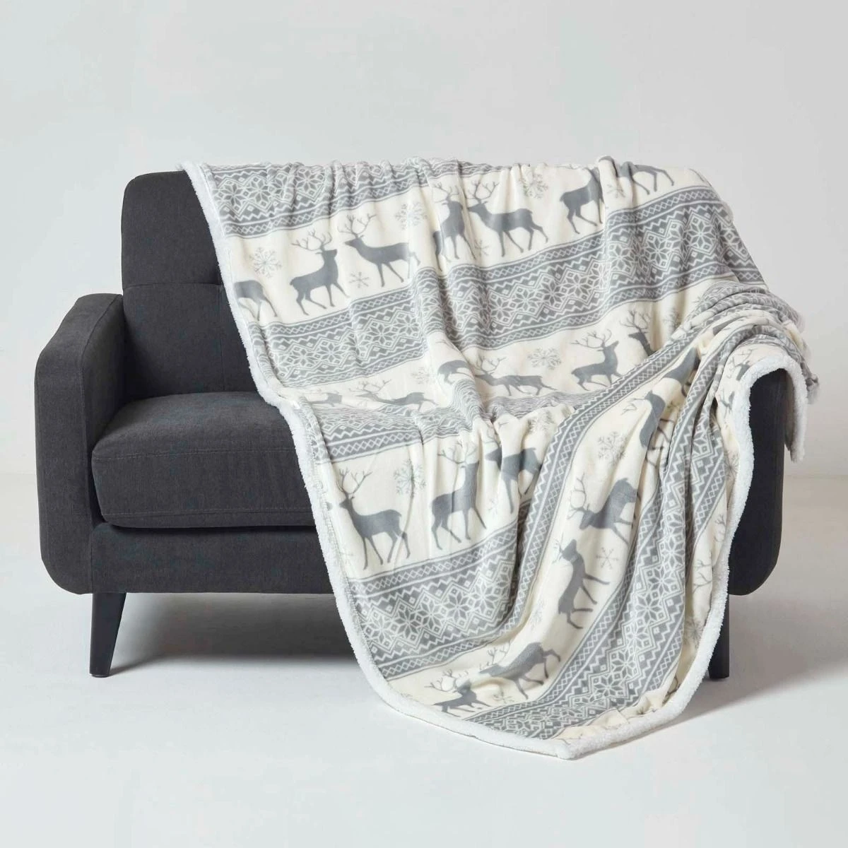Super soft grey throw, Scandi style Christmas throw with Nordic design, this cosy fleece throw with Sherpa throw reverse is the perfect for keeping warm relaxing on the sofa.