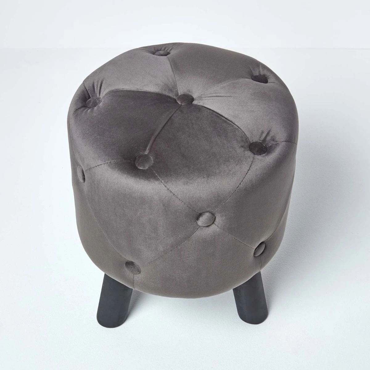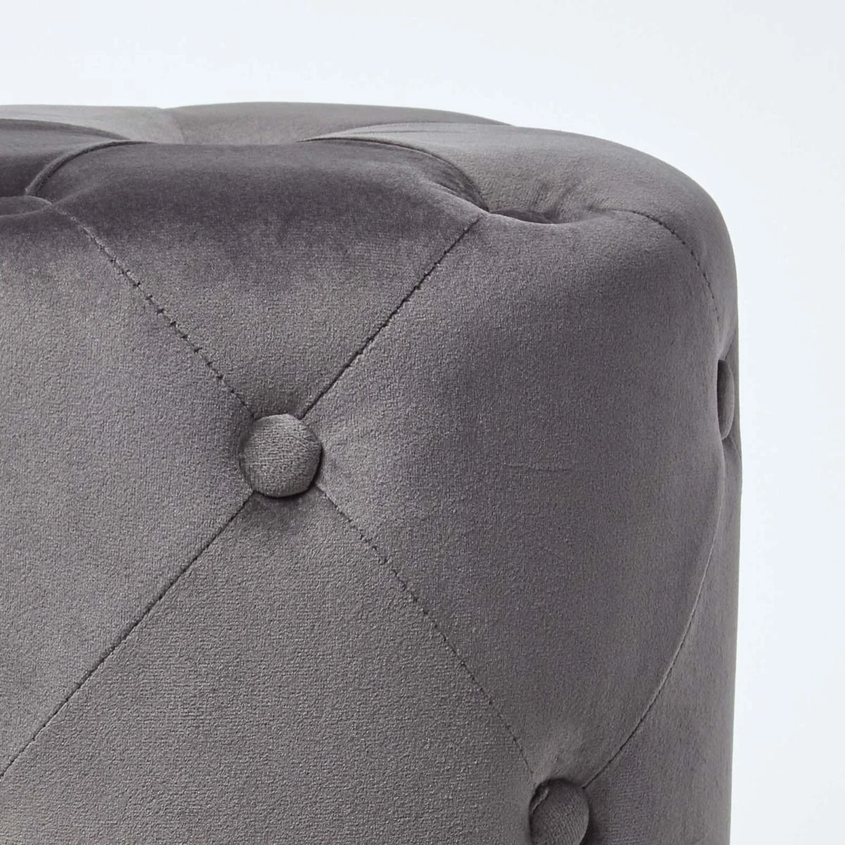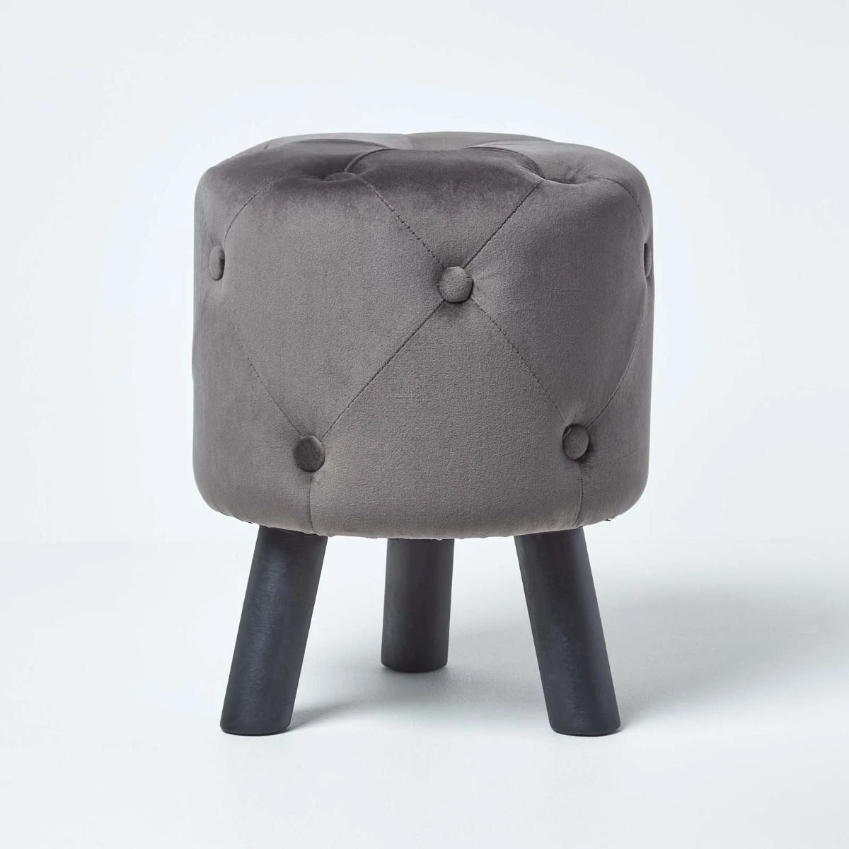 Dark grey pouffe with luxury quilted velvet design, this upholstered footstool with solid wooden legs features an on-trend diamond pattern with decorative buttons.