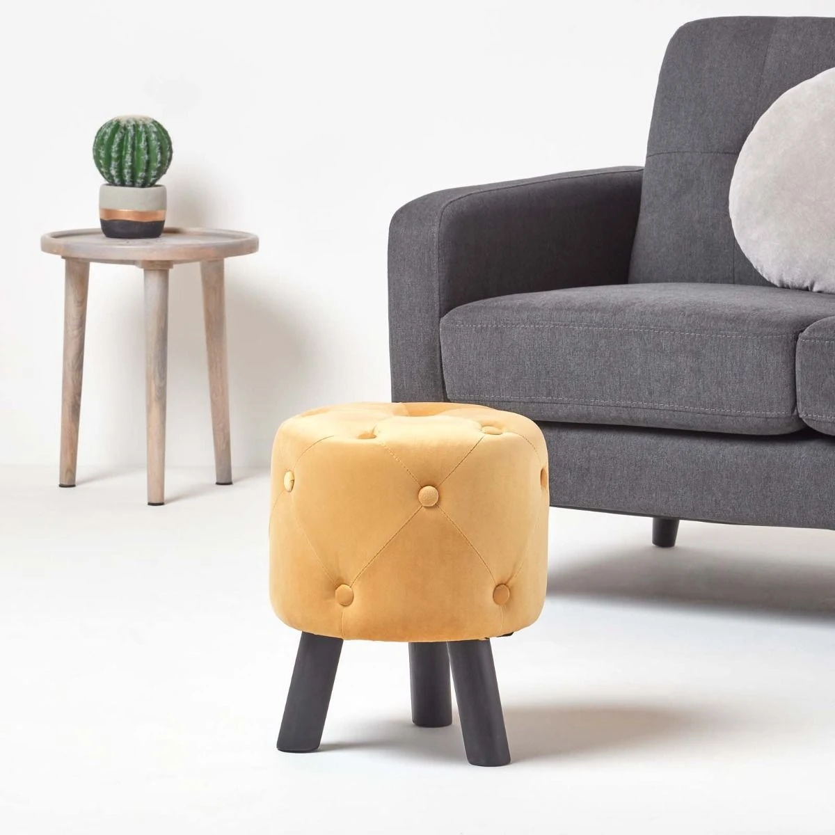 Add a touch of luxury with the Hampton velvet footstool. A round footstool upholstered in a soft mustard yellow velvet and quilted with a diamond design and decorative buttons. A classic sophisticated home accessory, this versatile pouffe can be used as a footrest, occasional seat or vanity stool.