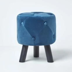 Blue velvet footstool set on wooden legs, luxury quilted navy footstool upholstered in a soft padded velvet with diamond quilted design and button decoration.
