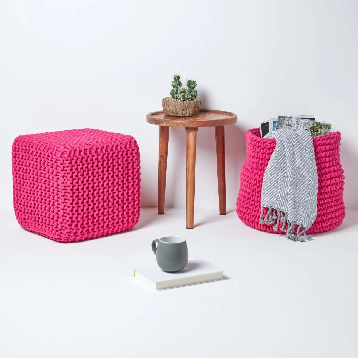 A truly versatile home accessory this square shaped footstool measures 35cm tall, it is perfect for resting your feet on after a long day and can be used as a small coffee table or occasional seat. Part of Homescapes collection of knitted pouffes and footstools, hot pink chunky knitted round pouffes also available.