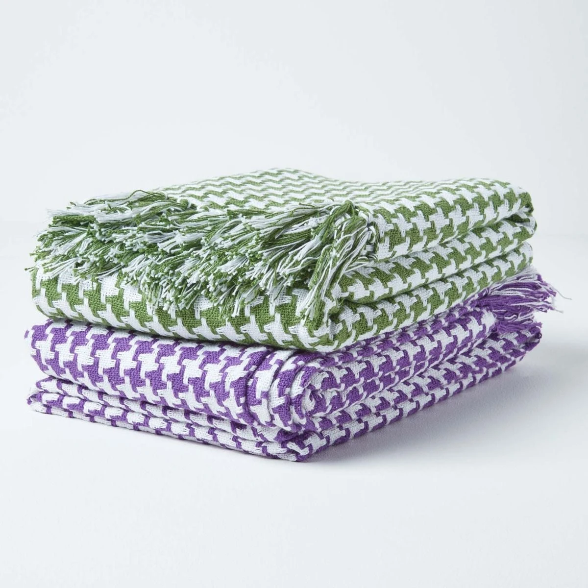 Homescapes Purple Houndstooth 100% Cotton Bedspread Throw makes a lasting effect with its brilliant check pattern. Crafted using a traditional hand loom in India, these covers are of the highest quality and are constructed using 100% soft cotton yarns. This means that the fabric bears a wonderful balance, obtained from the weaving of single yarns.The contemporary classic check designed originated in woven wool cloth in the Scottish lowlands, but has consistently proven itself as a stylish print over the years; just like stripes, it will never go out of fashion.