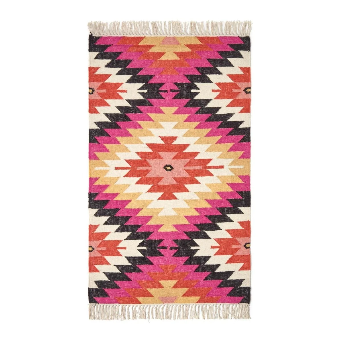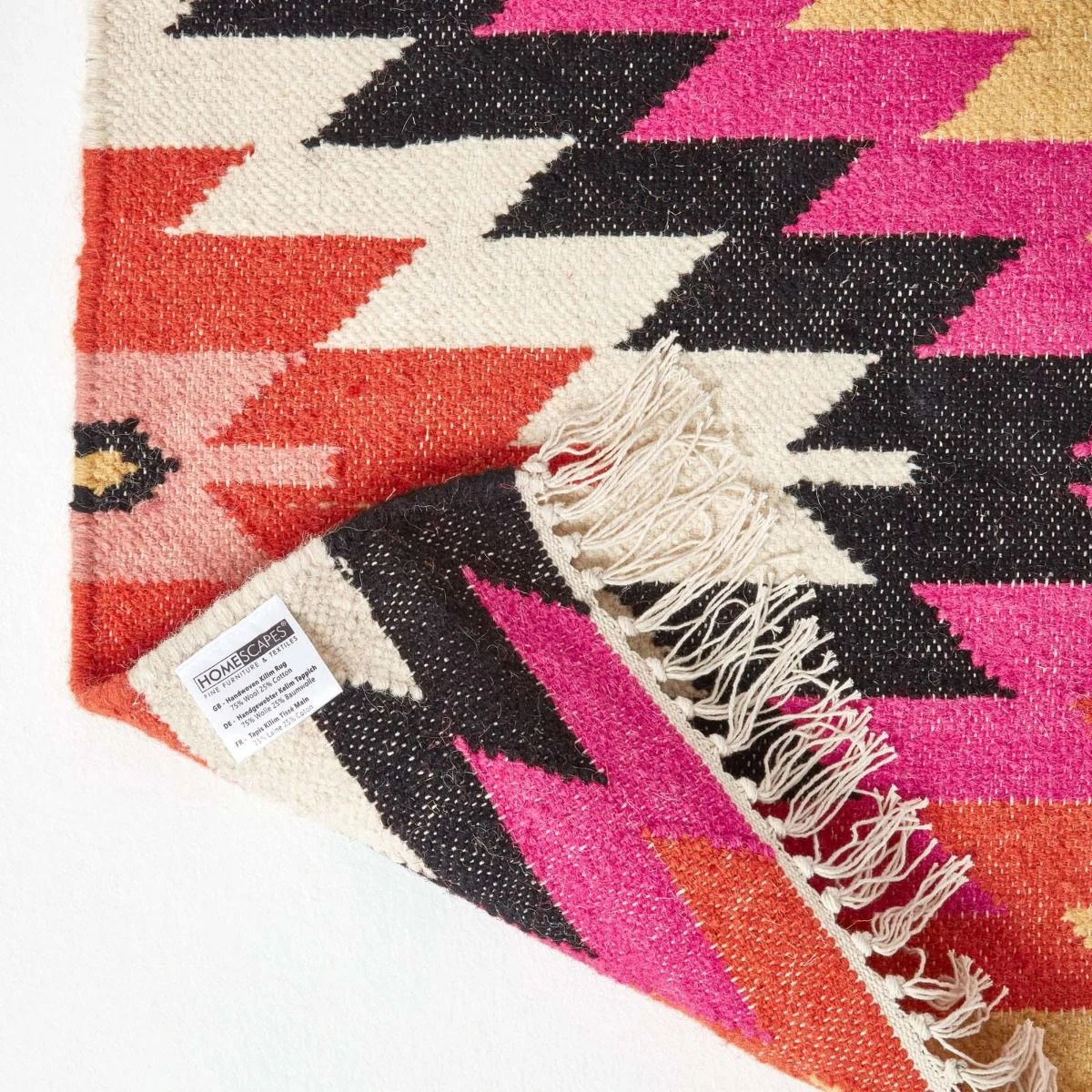 Pink, orange and yellow make up this tribal inspired colourful rug from Homescapes. The diamond style pattern of the Jakarta rug is finished with fringed ends for a stylish look to go with both contemporary as well as traditional style décor.
